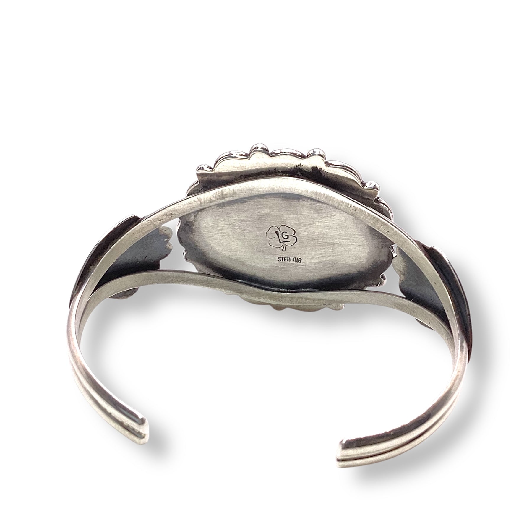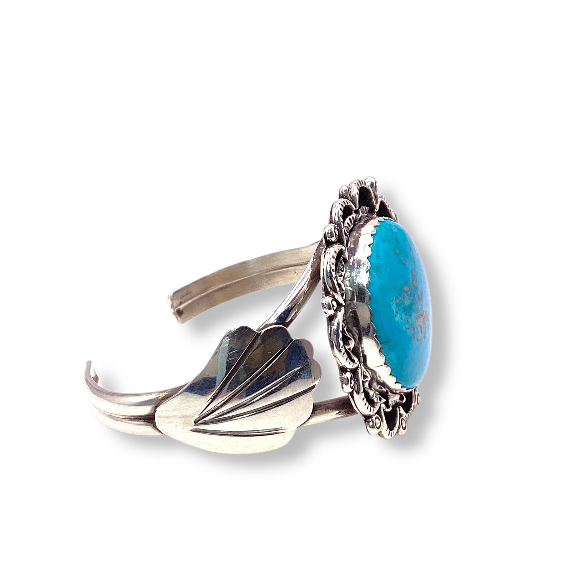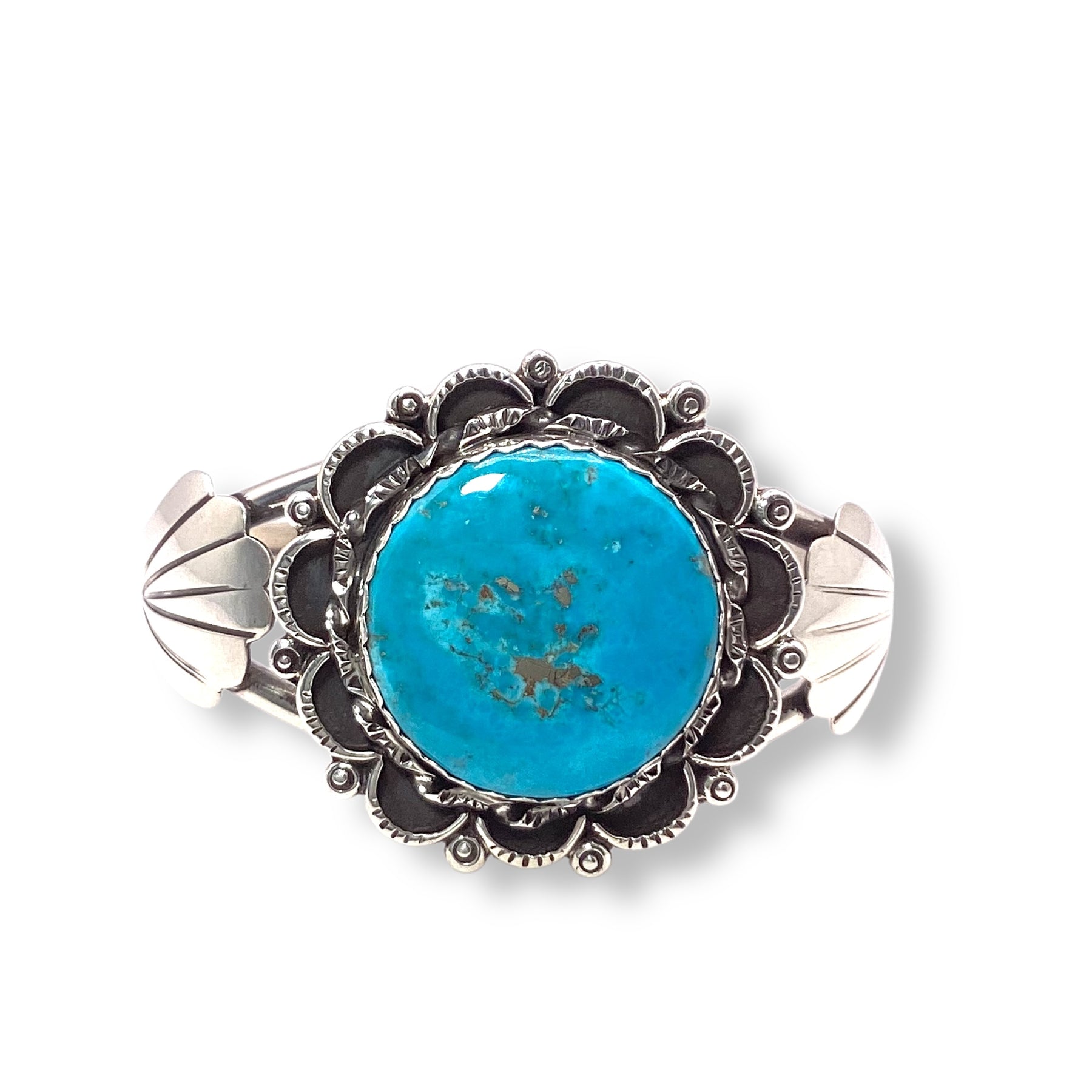 This Big Flower turquoise cuff by Navajo artist Lyanne Goodluck showcases a stunning stone set in a timeless scalloped bezel. Its elegant design offers both sophistication and versatility, perfect for stacking or wearing alone.