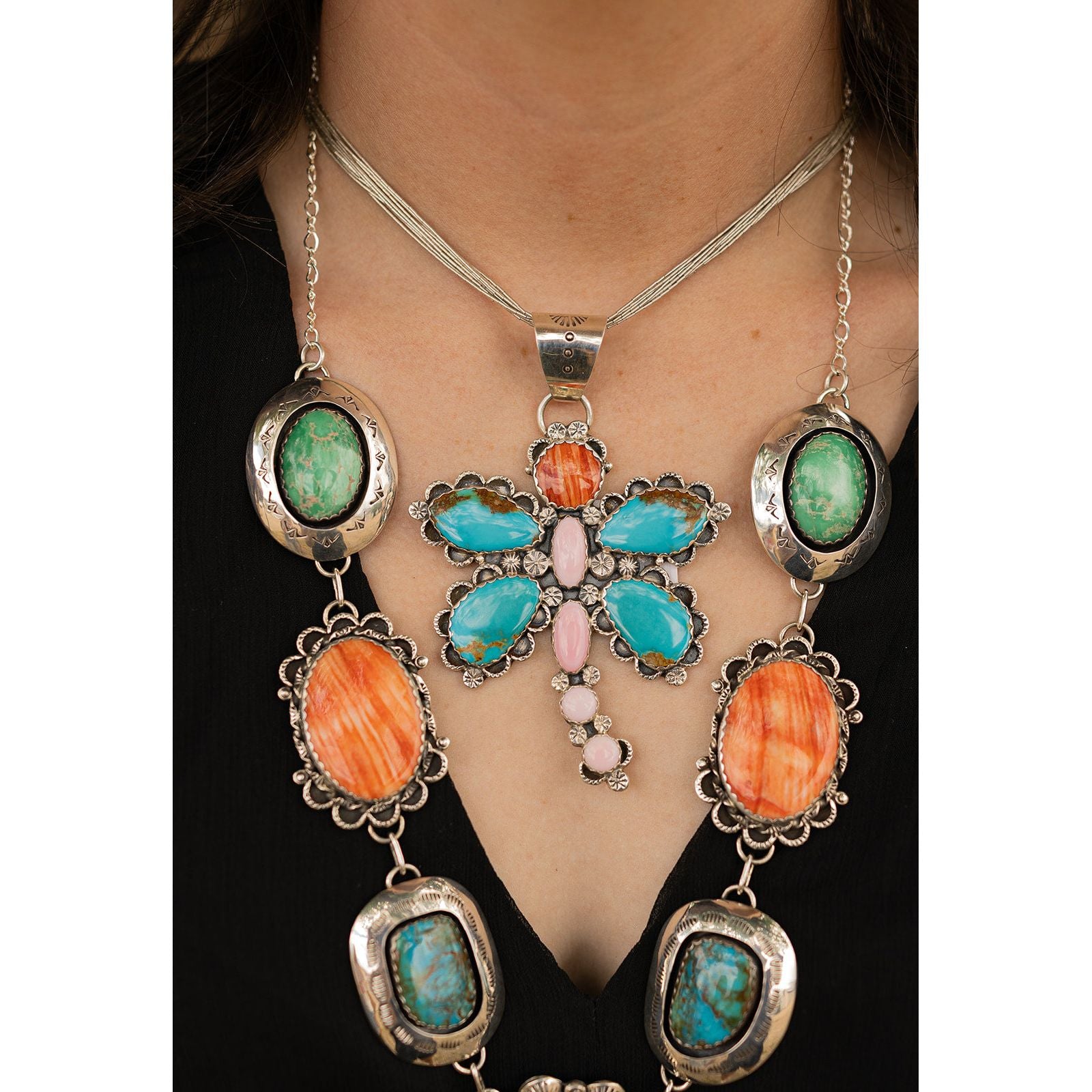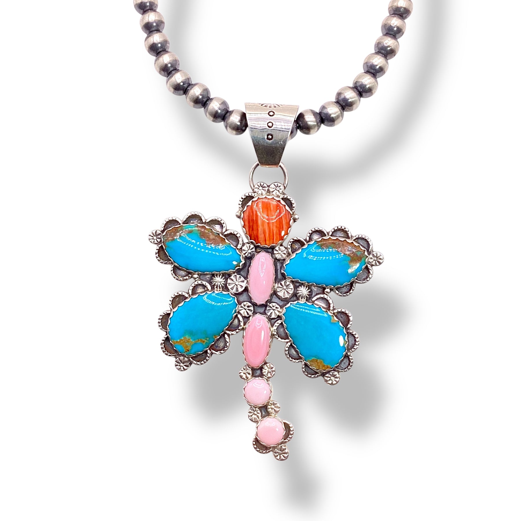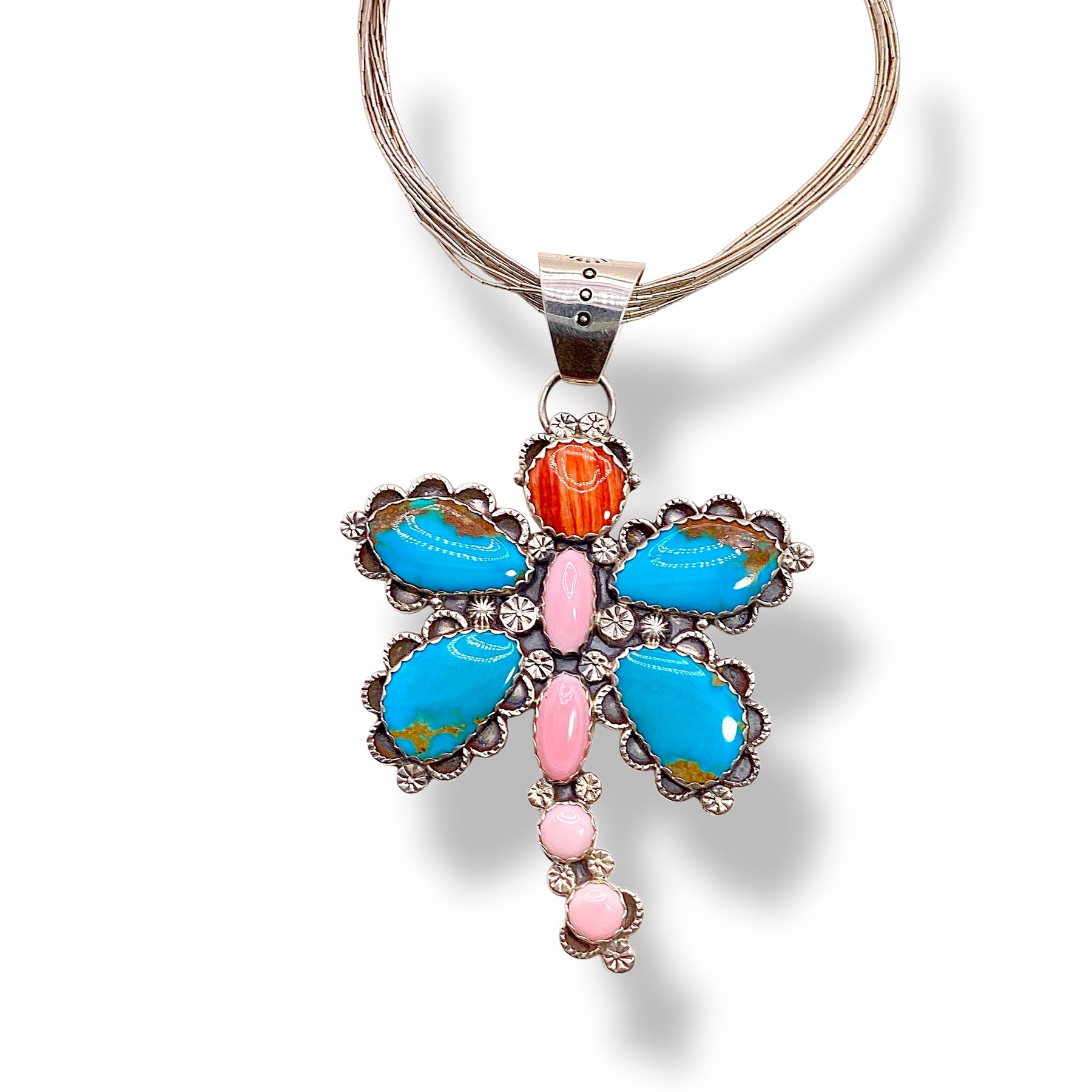Handmade by Navajo artist Lyanne Goodluck, this dragonfly pendant is pure desert-daydream magic. Featuring pops of Spiny Oyster Shell, Pink Conch Shell, and Turquoise in sterling silver scalloped bezels, finished with intricate, vintage-inspired stamp work.
