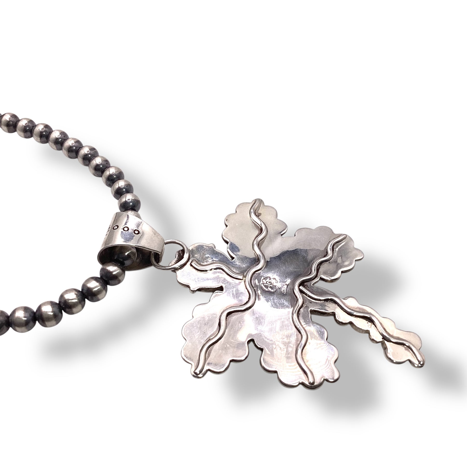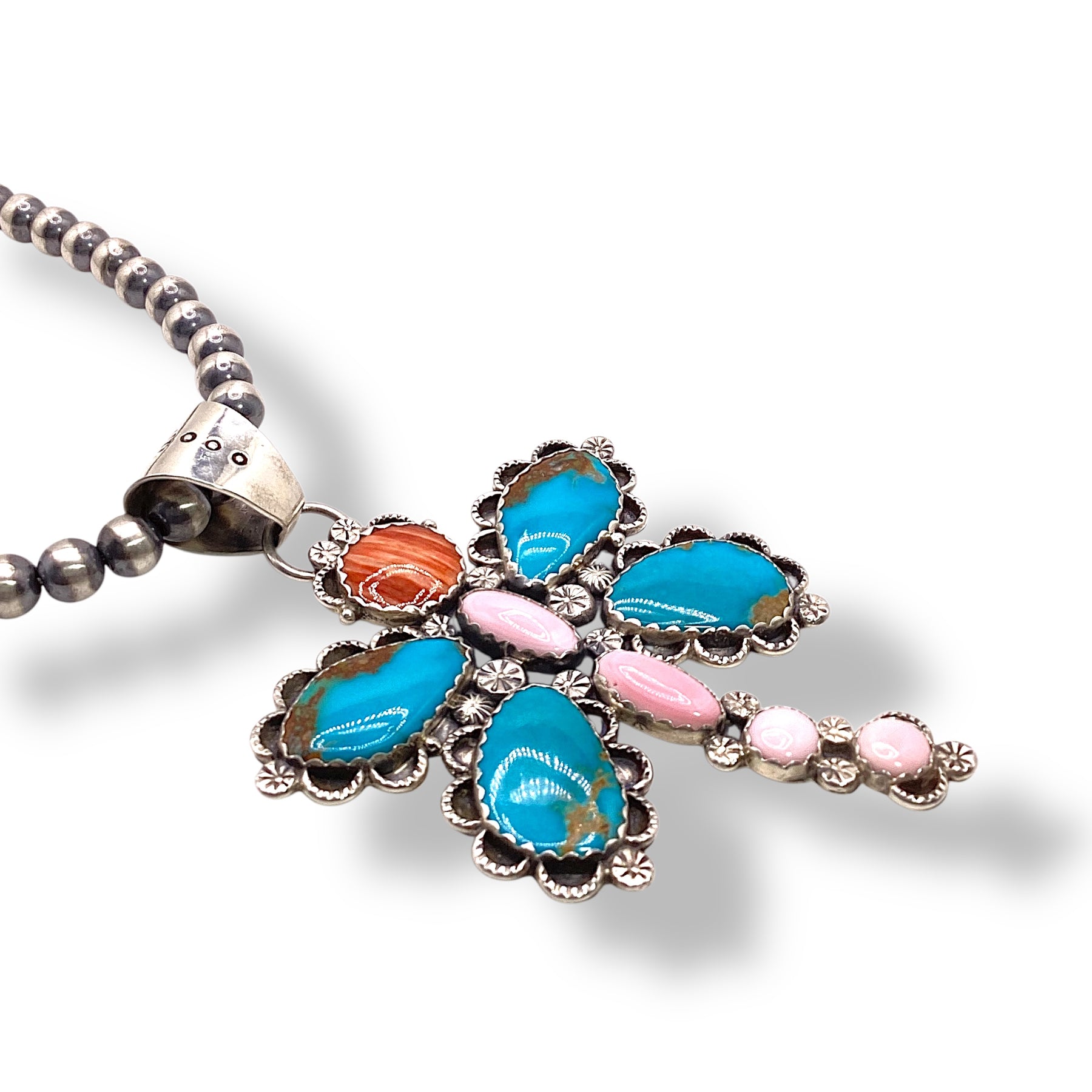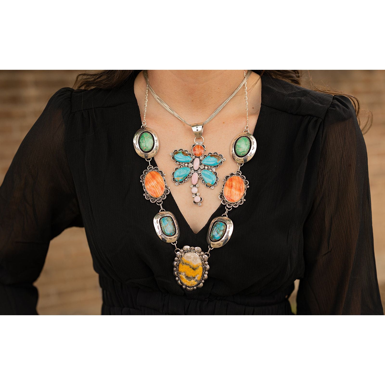 Handmade by Navajo artist Lyanne Goodluck, this dragonfly pendant is pure desert-daydream magic. Featuring pops of Spiny Oyster Shell, Pink Conch Shell, and Turquoise in sterling silver scalloped bezels, finished with intricate, vintage-inspired stamp work.