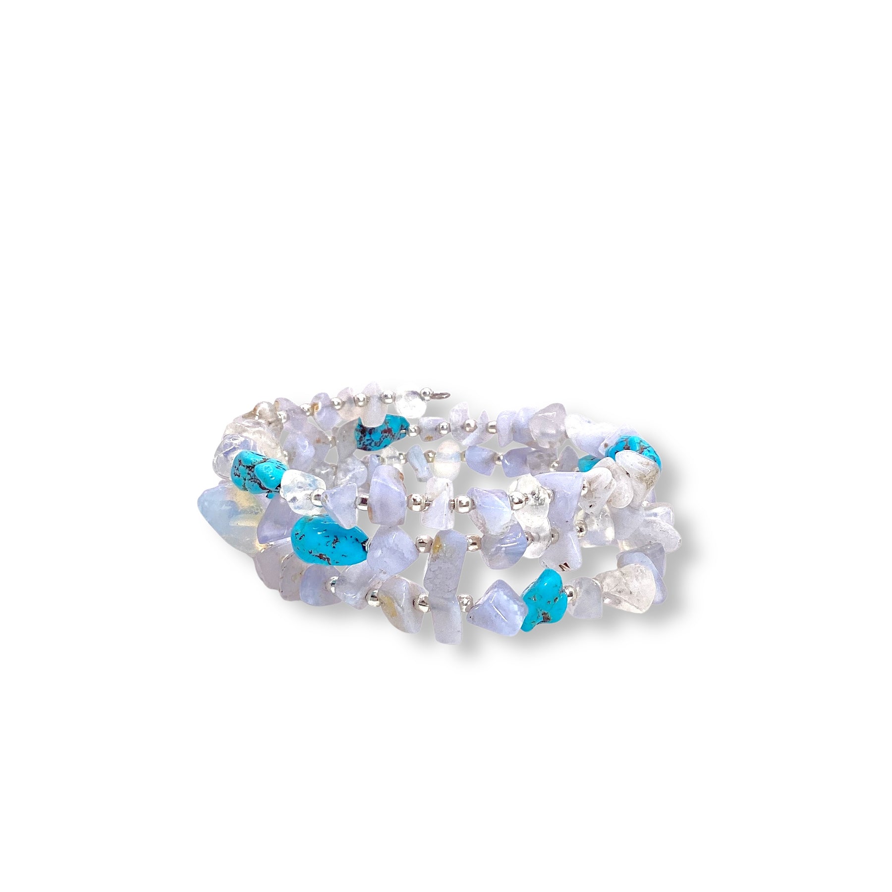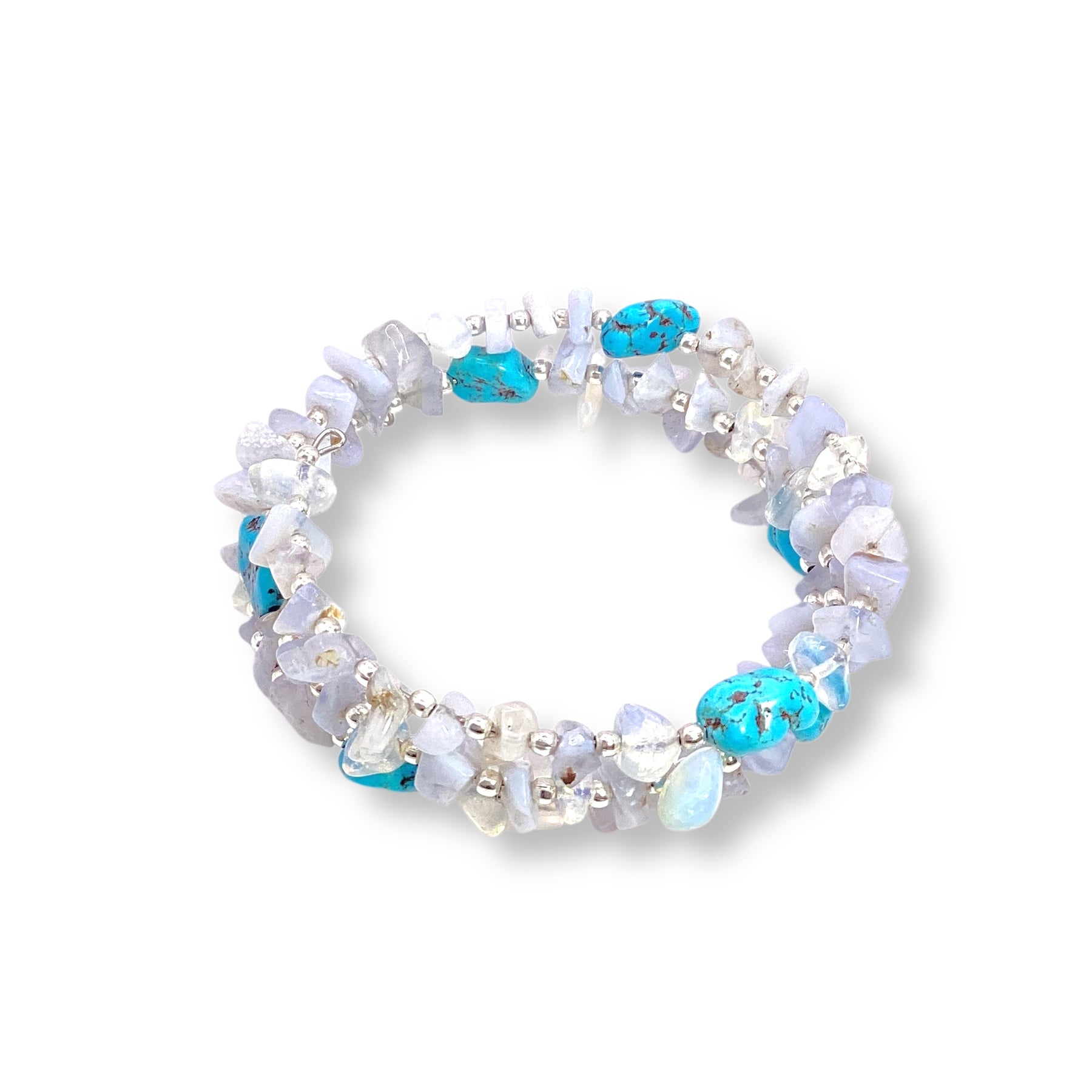 An absolute stunner by Santo Domingo artist Fannie Garcia — this authentic wrap bracelet blends dreamy moonstone, vibrant turquoise, and soft blue lace agate for a cool, effortless mix of color and texture you’ll reach for again and again.
