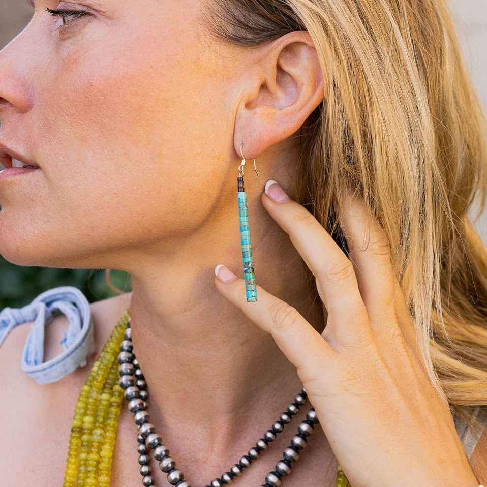 Santo Domingo artist Fannie Garcia brings the vibe with these turquoise and heishi shell dangle earrings. Earthy, bold, and effortlessly cool — they sway with every move.