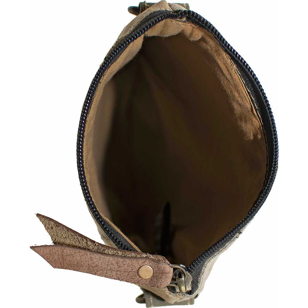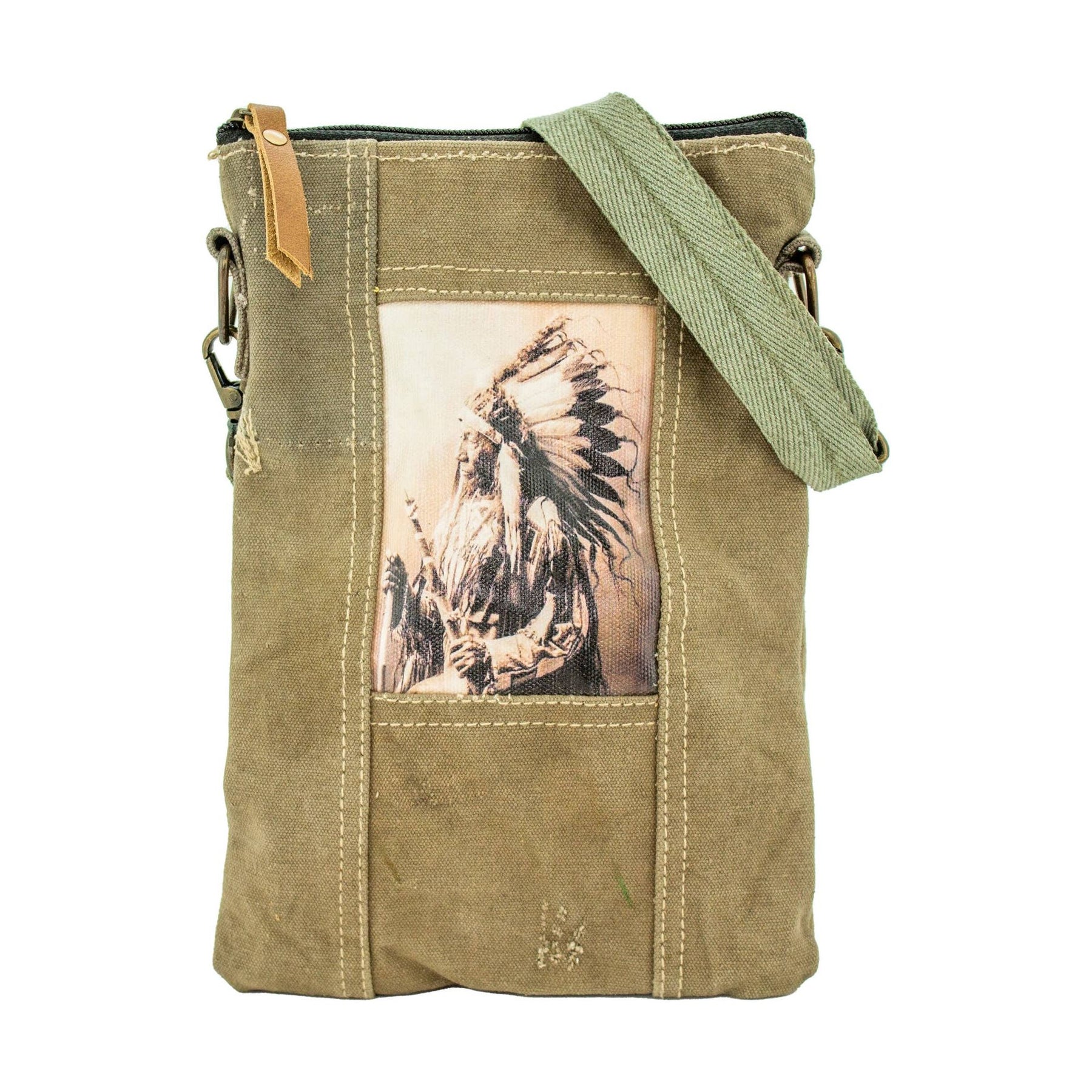 Cute small recycled military tent crossbody adorned with a print patch on the front. Perfect to carry the very basics! DISCLAIMER: Our recycled military tent bags are a tribute to and a reminder of the sacrifices and contributions of military veterans. Please know that these bags are made from authentic used military tents and are not brand-new canvas packaged as recycled tents or tarps.