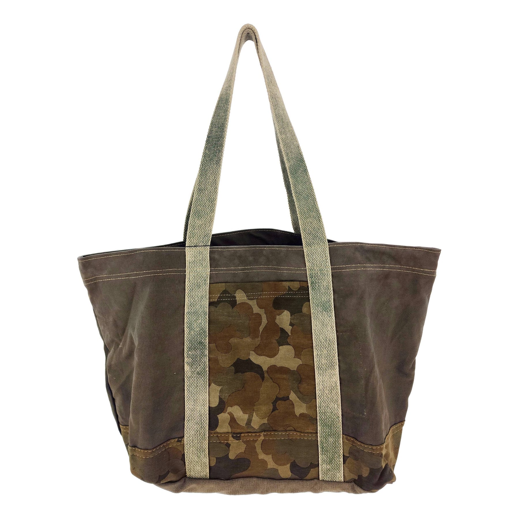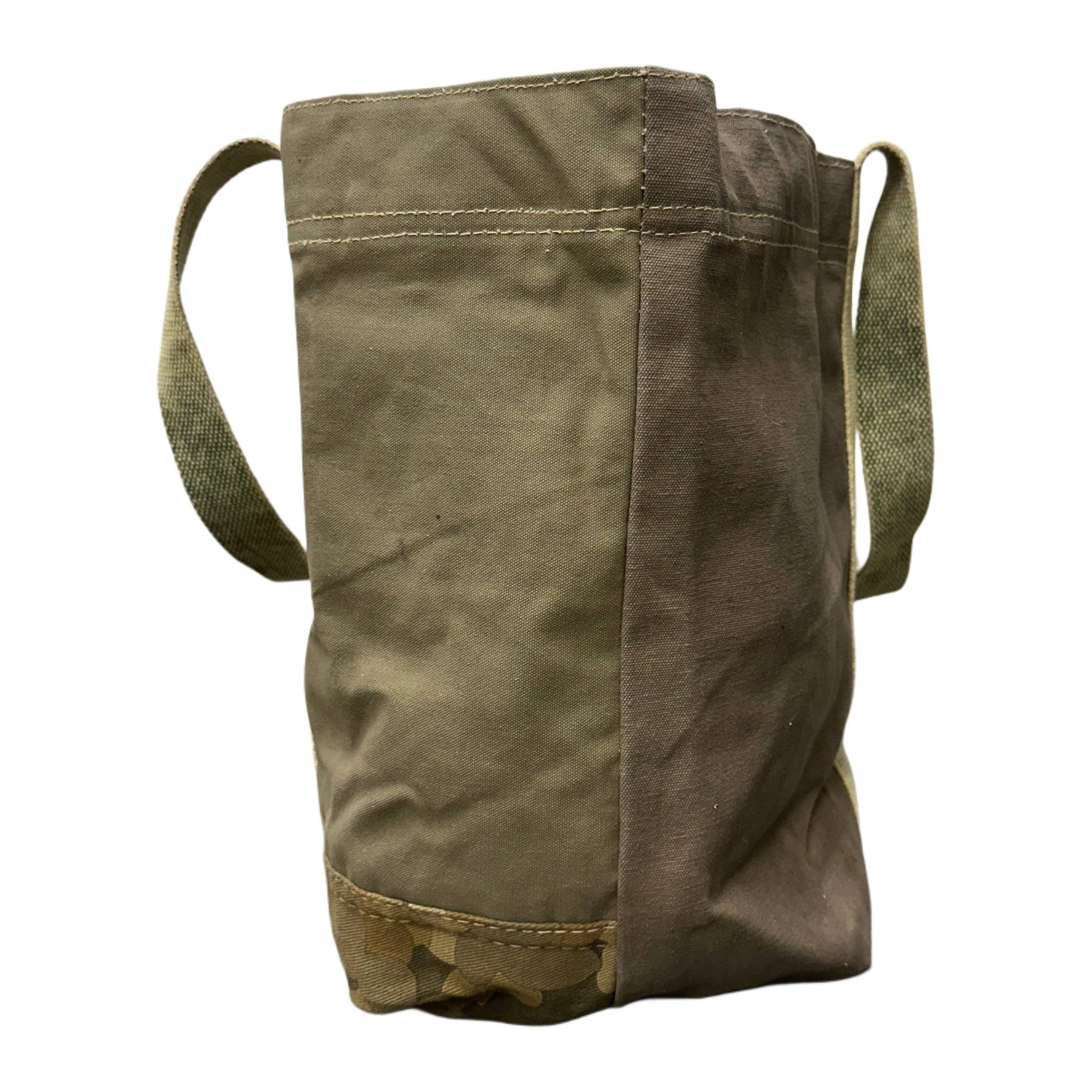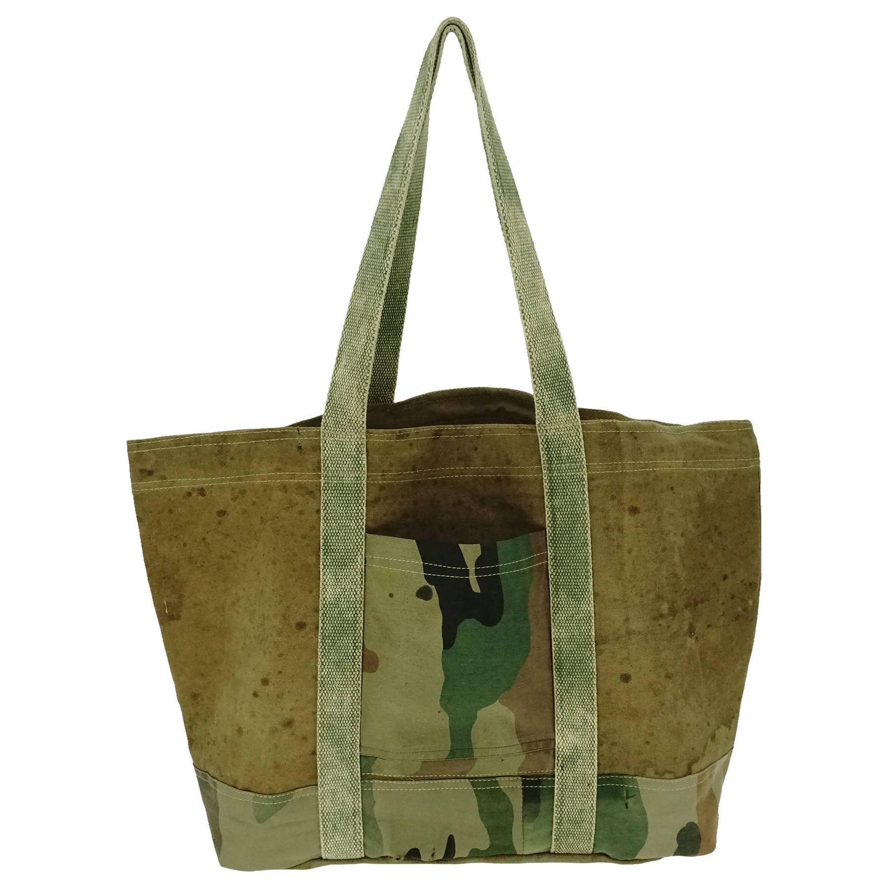 Our eco-friendly large tote is handcrafted with recycled military tent fabric and accented with repurposed camouflage. It has an open top, 1 outside pocket, 1 interior pocket, and is fully lined. DISCLAIMER: Our recycled military tent bags are a tribute to & a reminder of the sacrifices & contributions of military veterans. Please know that these bags are made from authentic used military tents and are not new canvas packaged as recycled tents or tarps. THESE ARE THE REAL DEAL!! As a result, the tent material will show signs of worn-like imperfections which add to its character. Each bag has differences in genuine imperfections, stains, and colors. Your bag will be as unique as each soldier's experience when seeking shelter in these tents whether in the training field or in a combat zone. All Camo prints will vary in color & prints, some will have foliage as in shown photos. No 2 alike. All Sales Final. Dimensions: 26"W x 15"H x 7"D. Distressed green cotton webbing strap 12" drop.