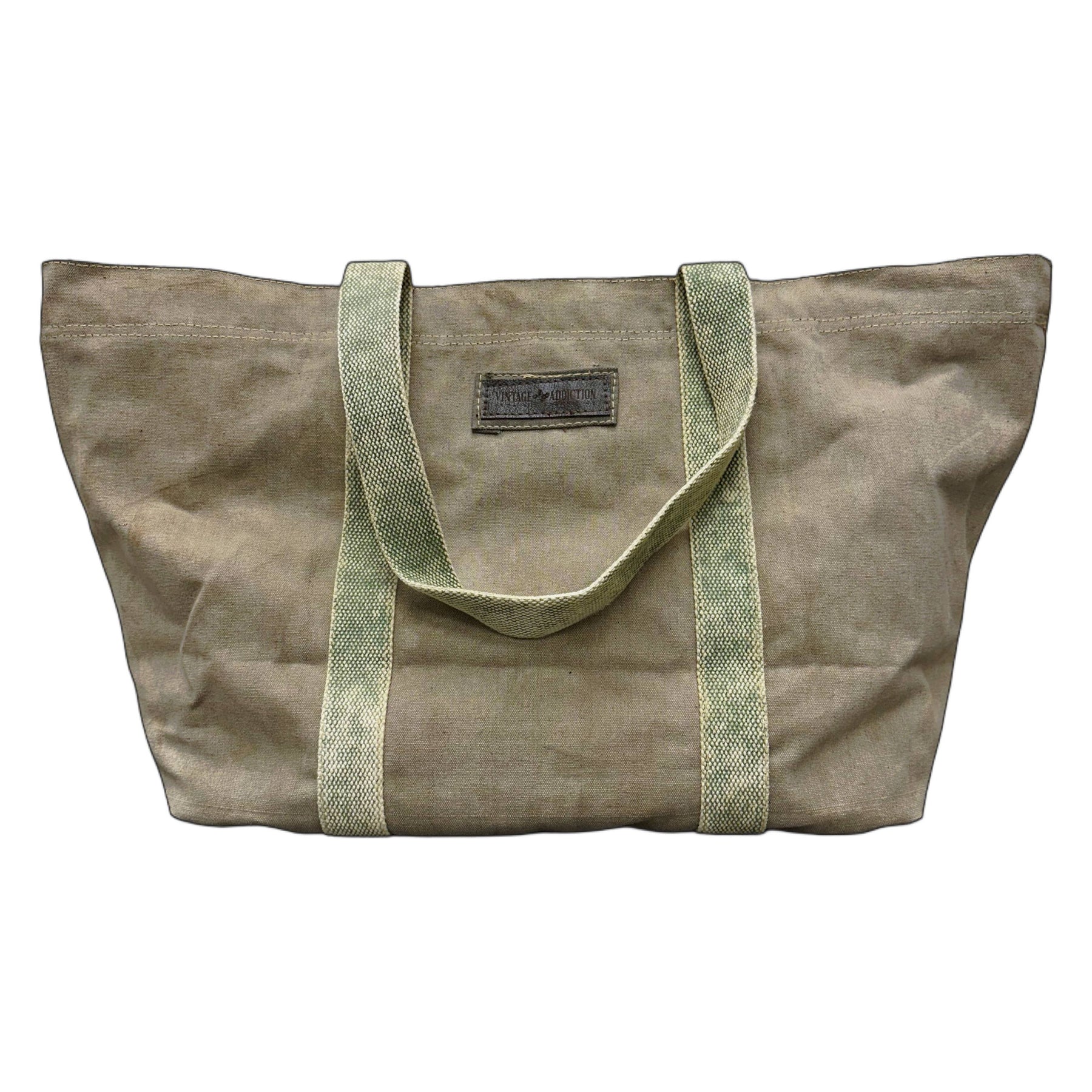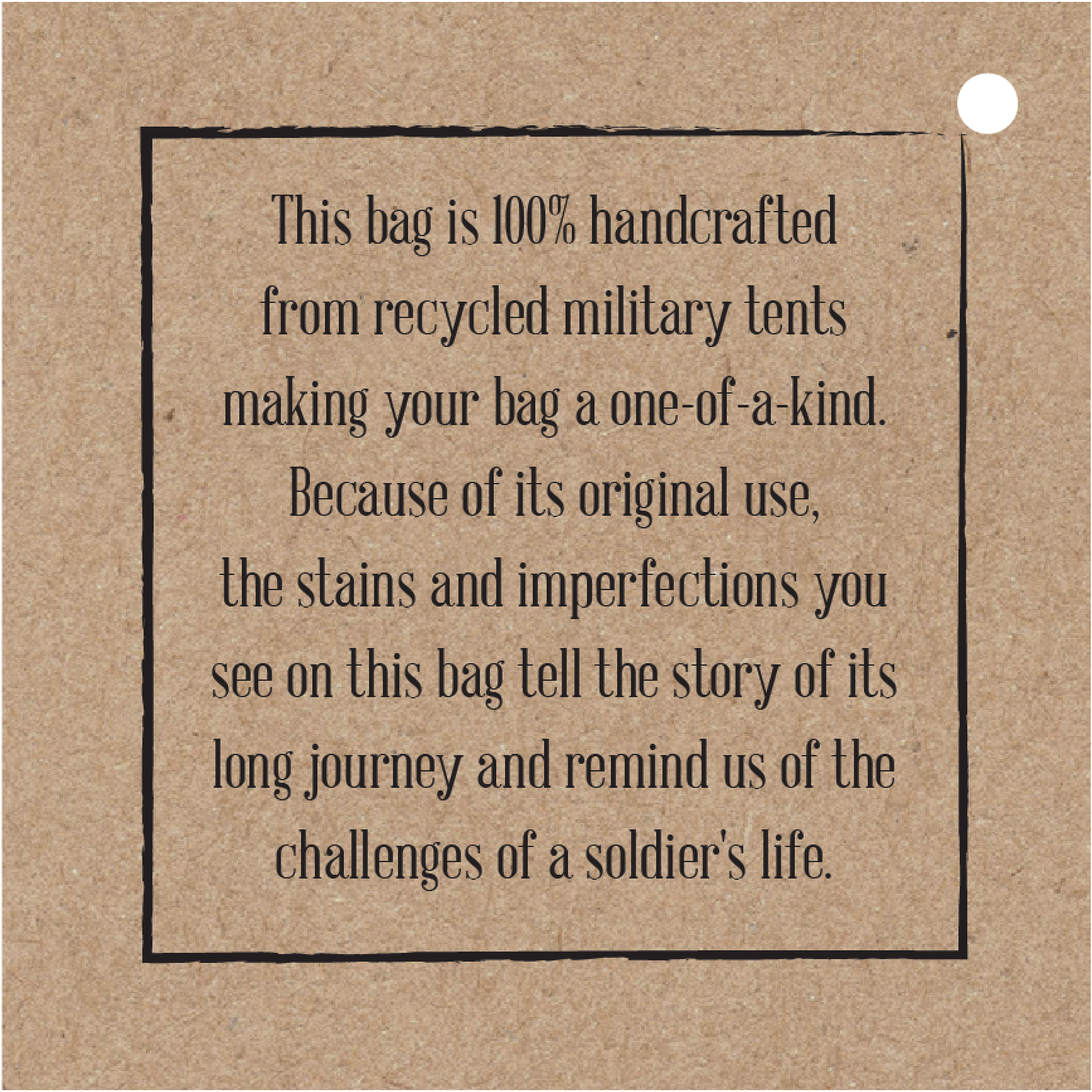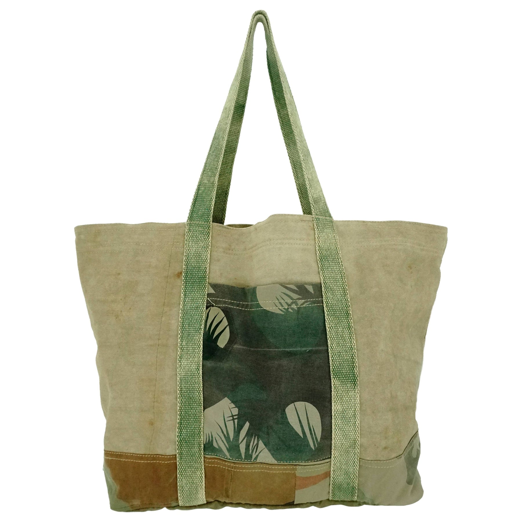 Our eco-friendly large tote is handcrafted with recycled military tent fabric and accented with repurposed camouflage. It has an open top, 1 outside pocket, 1 interior pocket, and is fully lined. DISCLAIMER: Our recycled military tent bags are a tribute to & a reminder of the sacrifices & contributions of military veterans. Please know that these bags are made from authentic used military tents and are not new canvas packaged as recycled tents or tarps. THESE ARE THE REAL DEAL!! As a result, the tent material will show signs of worn-like imperfections which add to its character. Each bag has differences in genuine imperfections, stains, and colors. Your bag will be as unique as each soldier's experience when seeking shelter in these tents whether in the training field or in a combat zone. All Camo prints will vary in color & prints, some will have foliage as in shown photos. No 2 alike. All Sales Final. Dimensions: 26"W x 15"H x 7"D. Distressed green cotton webbing strap 12" drop.