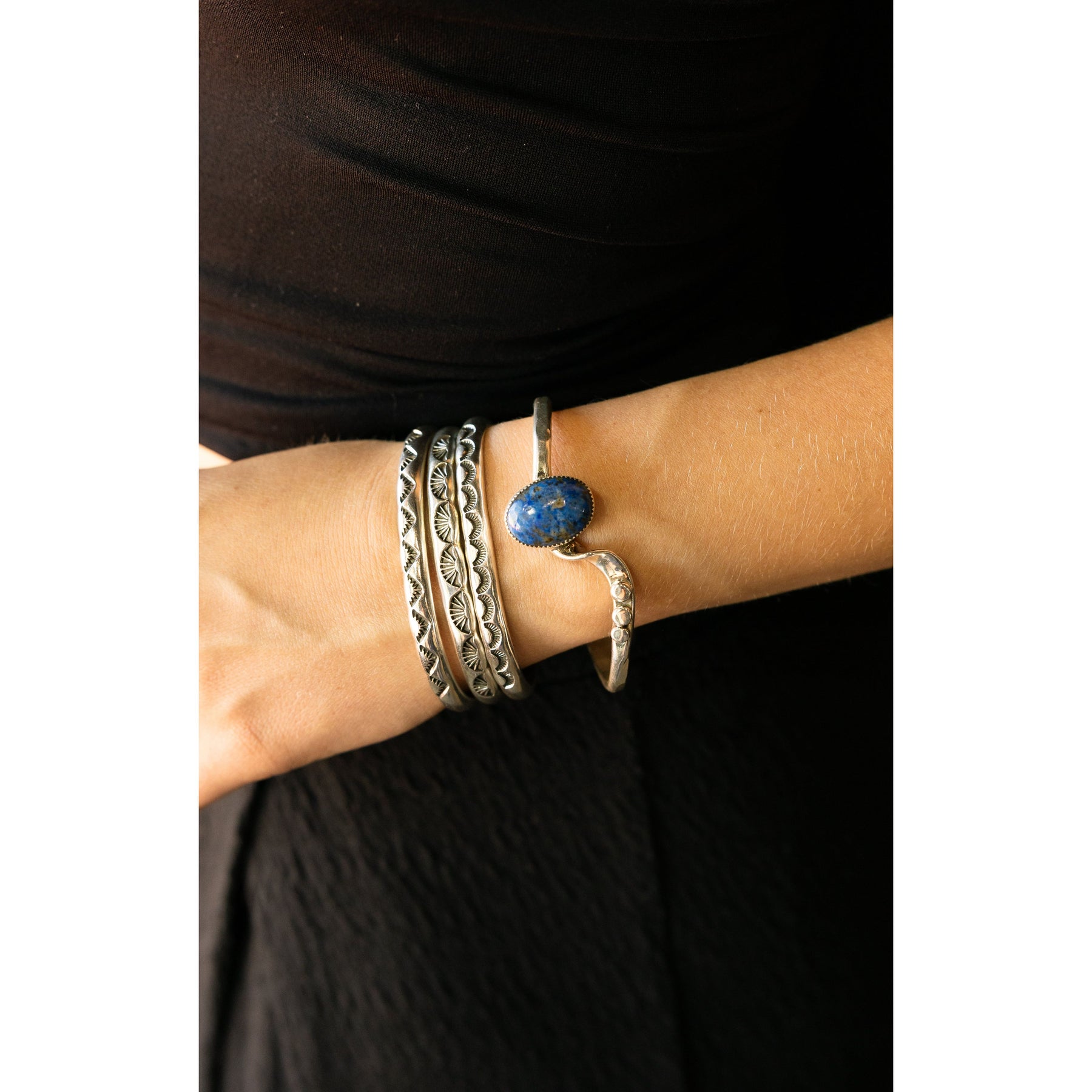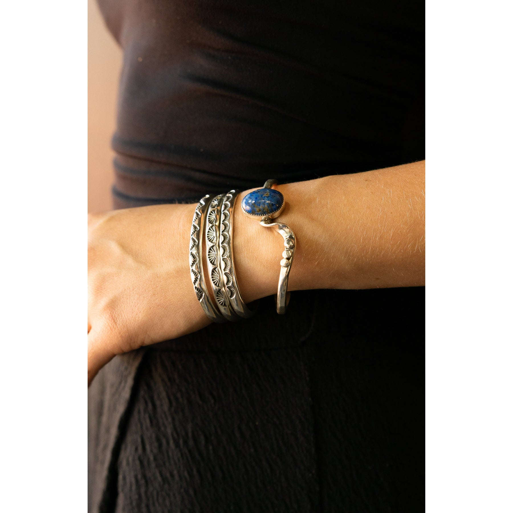Handcrafted by Hispanic silversmith and artist Lazaro Gutierrez, this sterling silver cuff showcases a rich lapis stone, set in a sawtooth bezel. The unique ribbon-like band flows gracefully around the wrist, making it perfect for stacking or standing beautifully on its own.