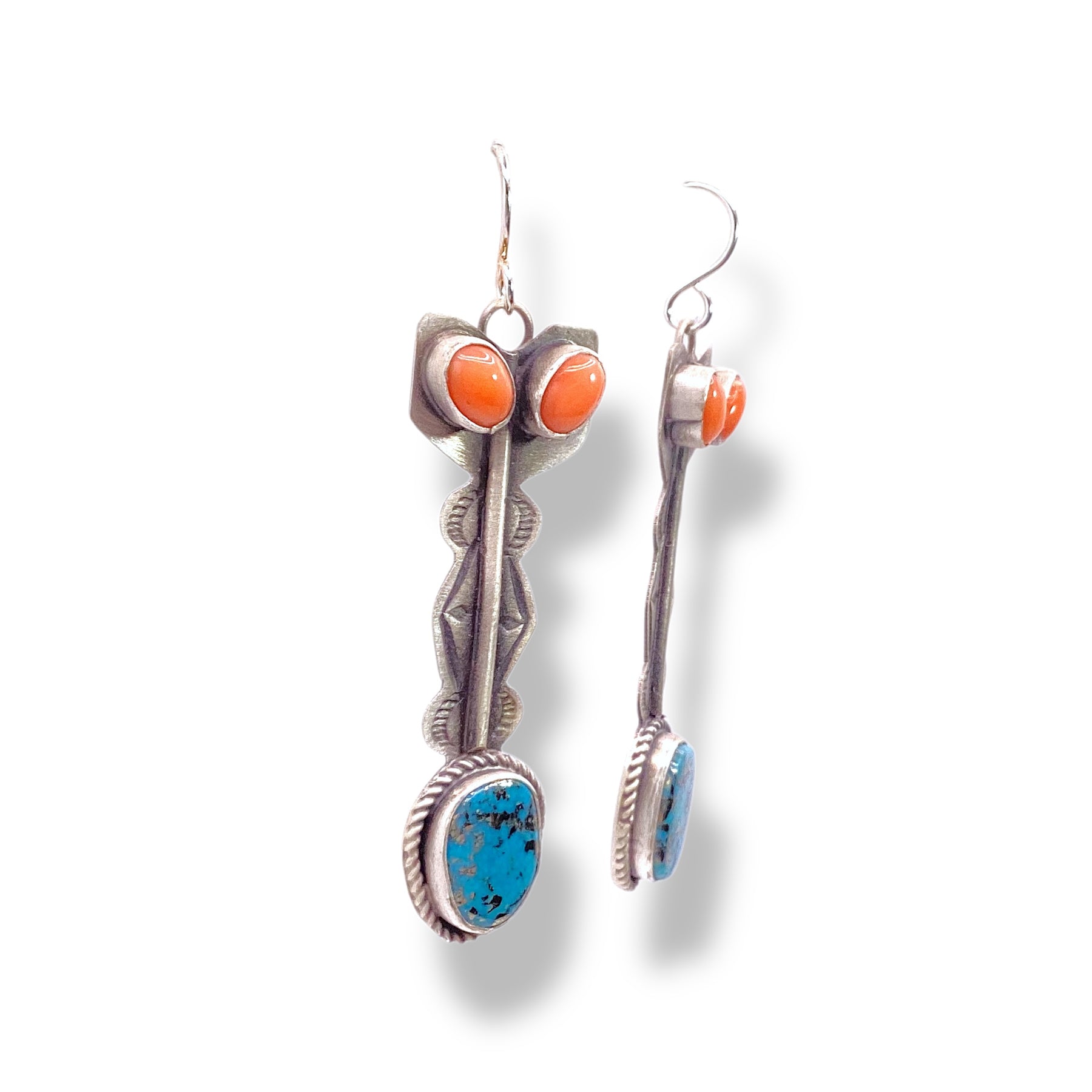 These beautiful earrings exude southwestern. Set in a smooth silver bezel with vintage Morenci turquoise, hand stamping, and rare pink coral from our suppliers in the Mediterranean.