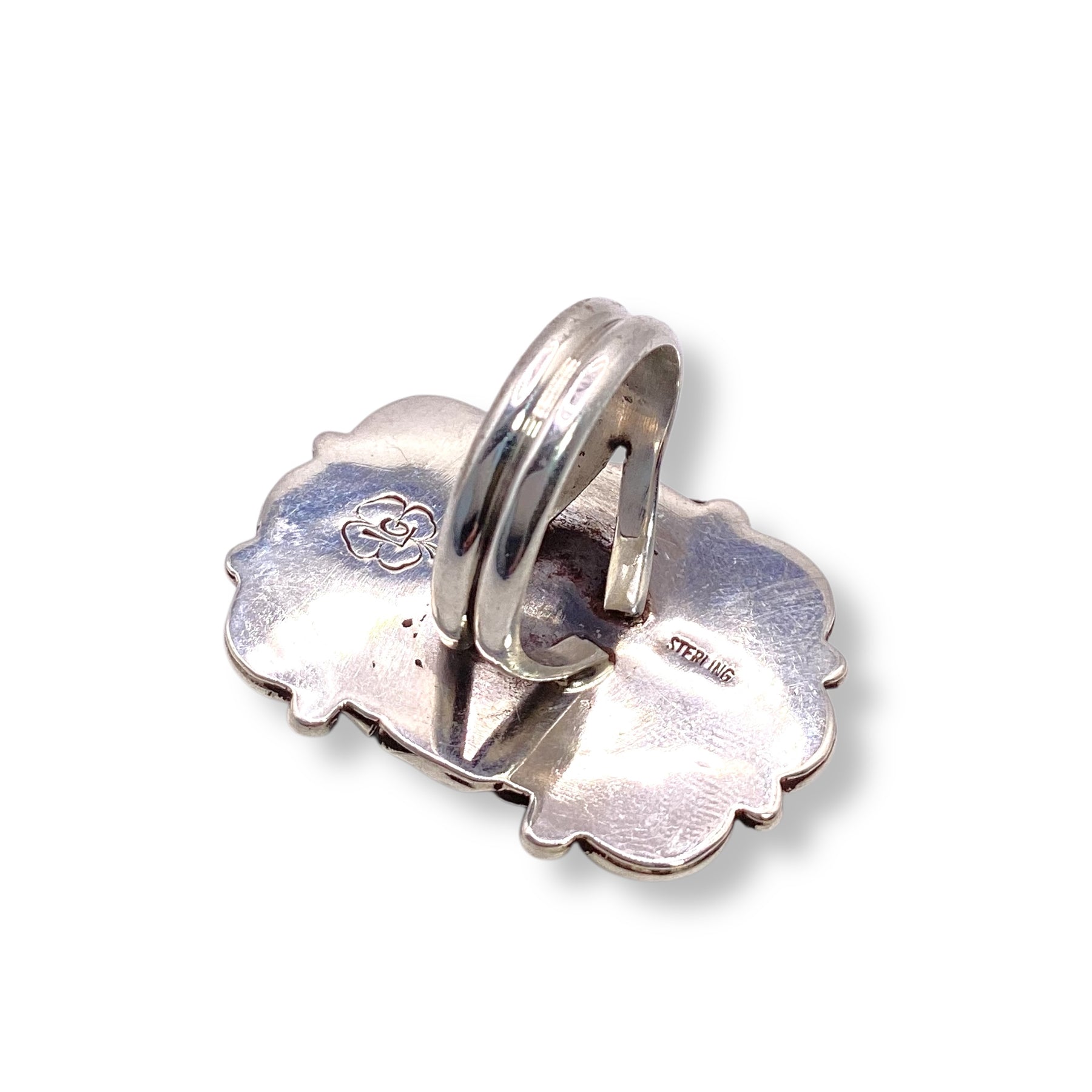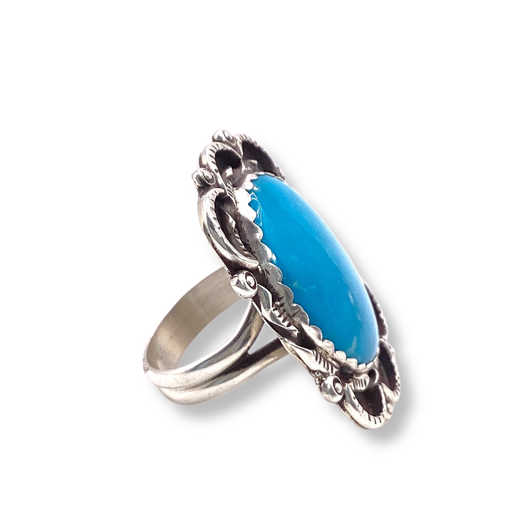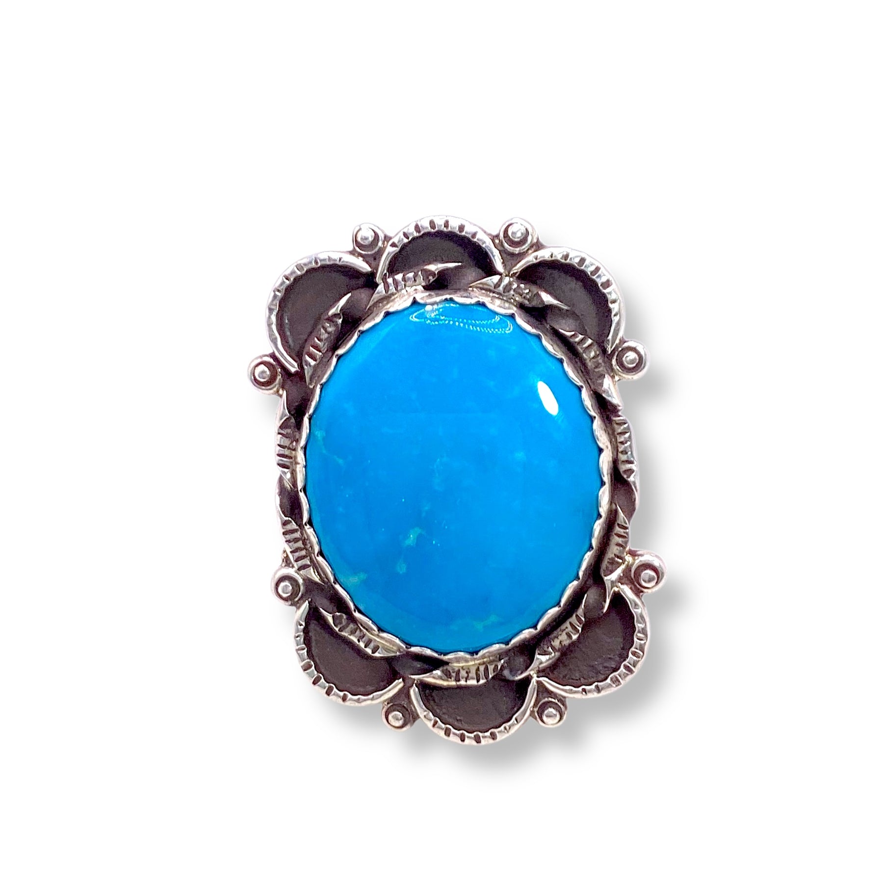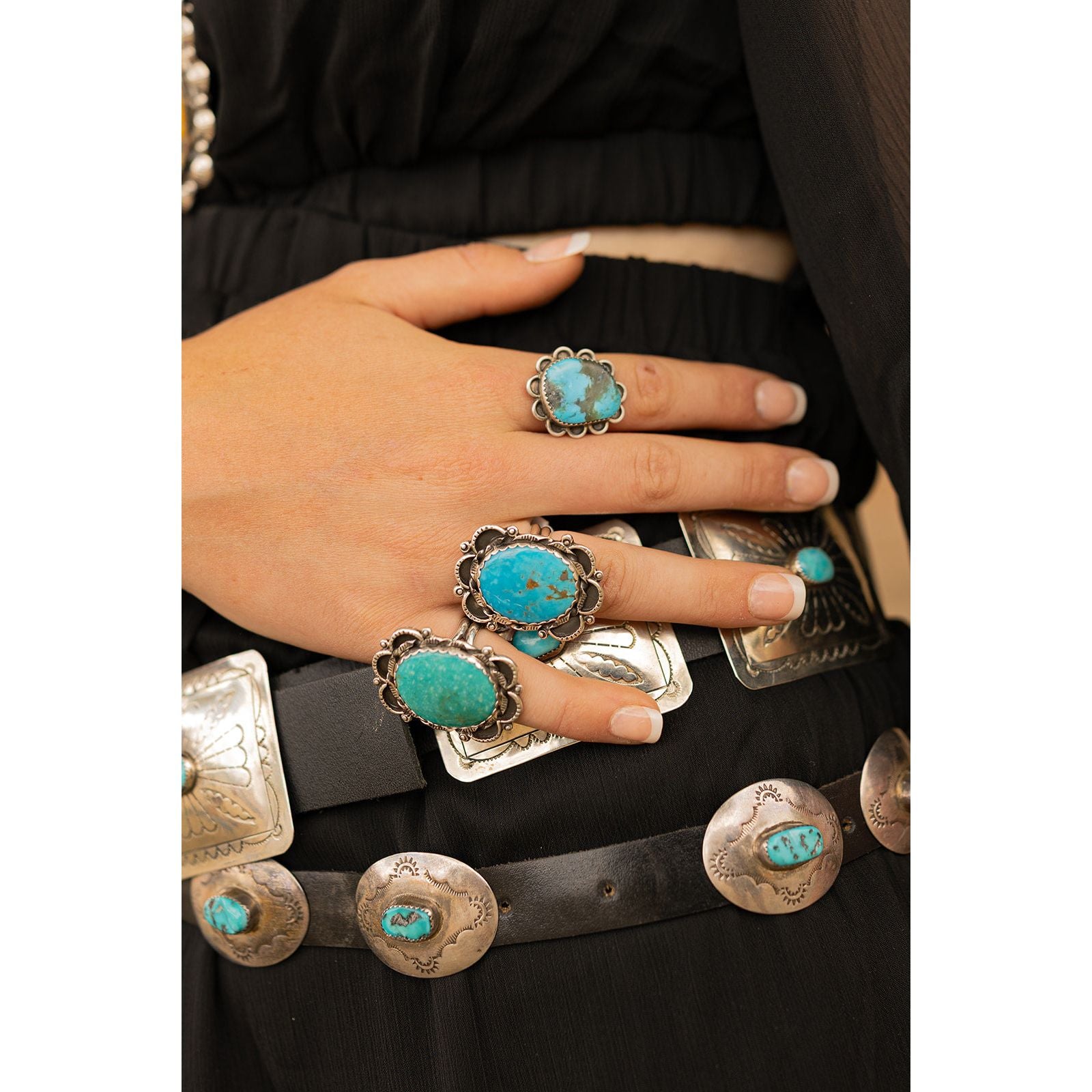 Handcrafted by Navajo artist Lyanne Goodluck, this sterling silver ring features a dreamy turquoise stone wrapped in a scalloped bezel, finished with gorgeous hand-worked silver details. It’s bold, soulful, and made to be worn on repeat.