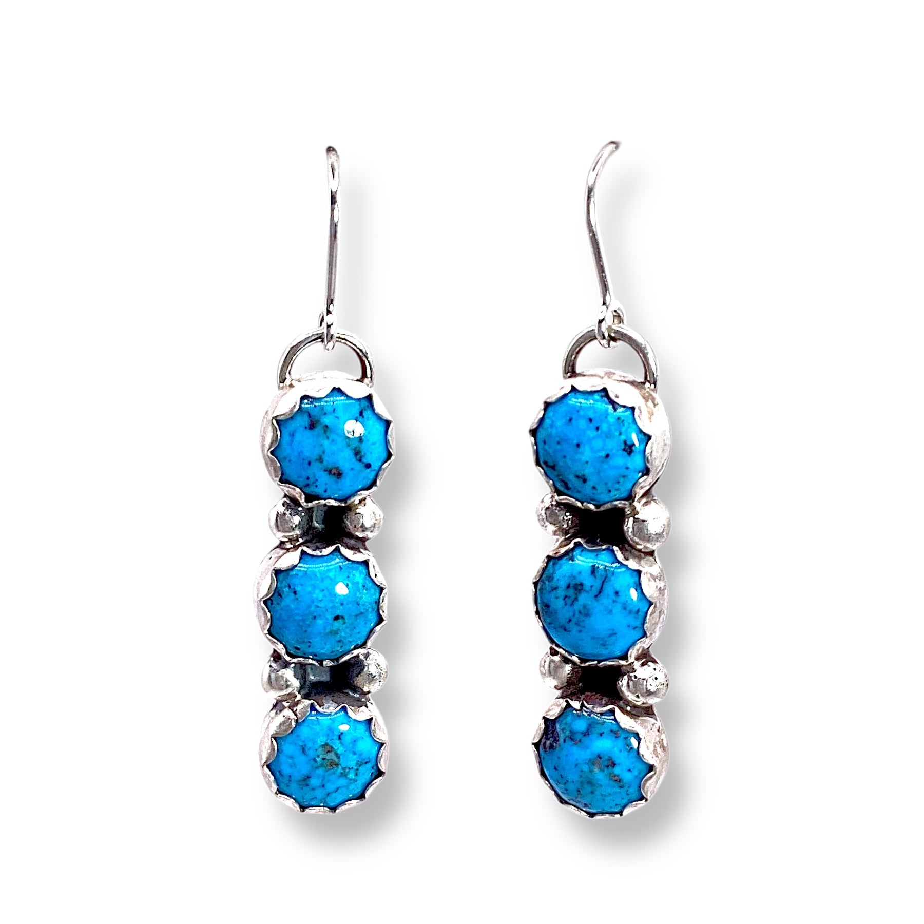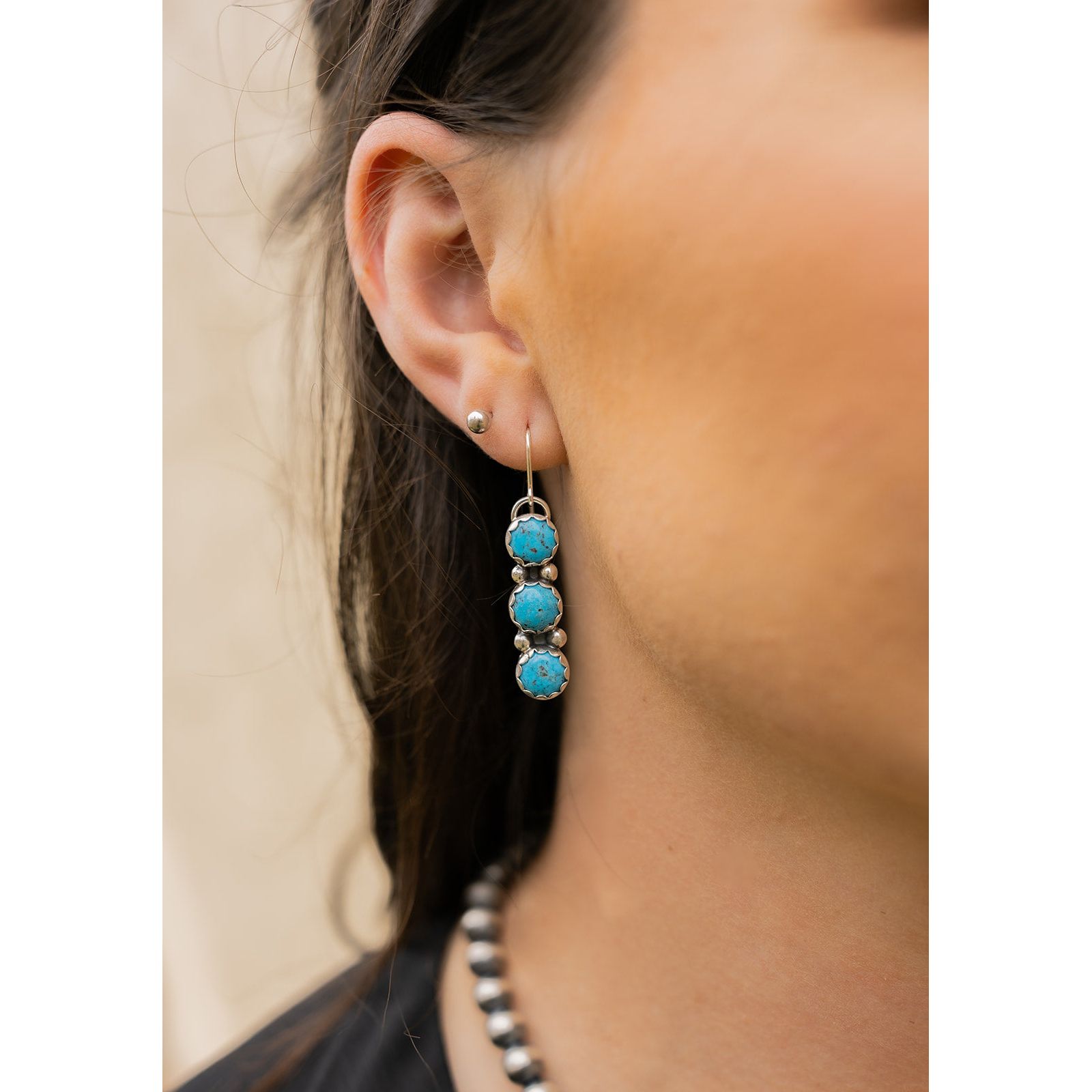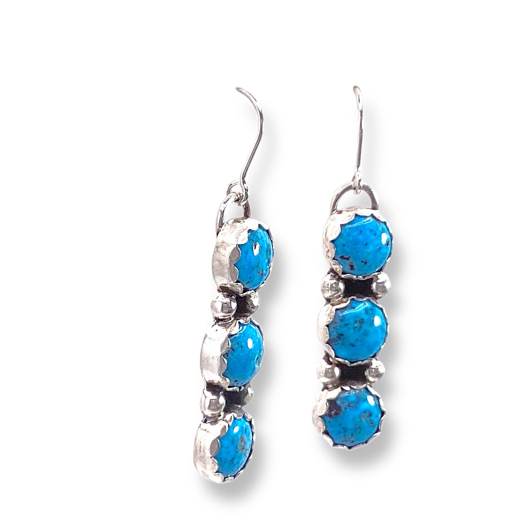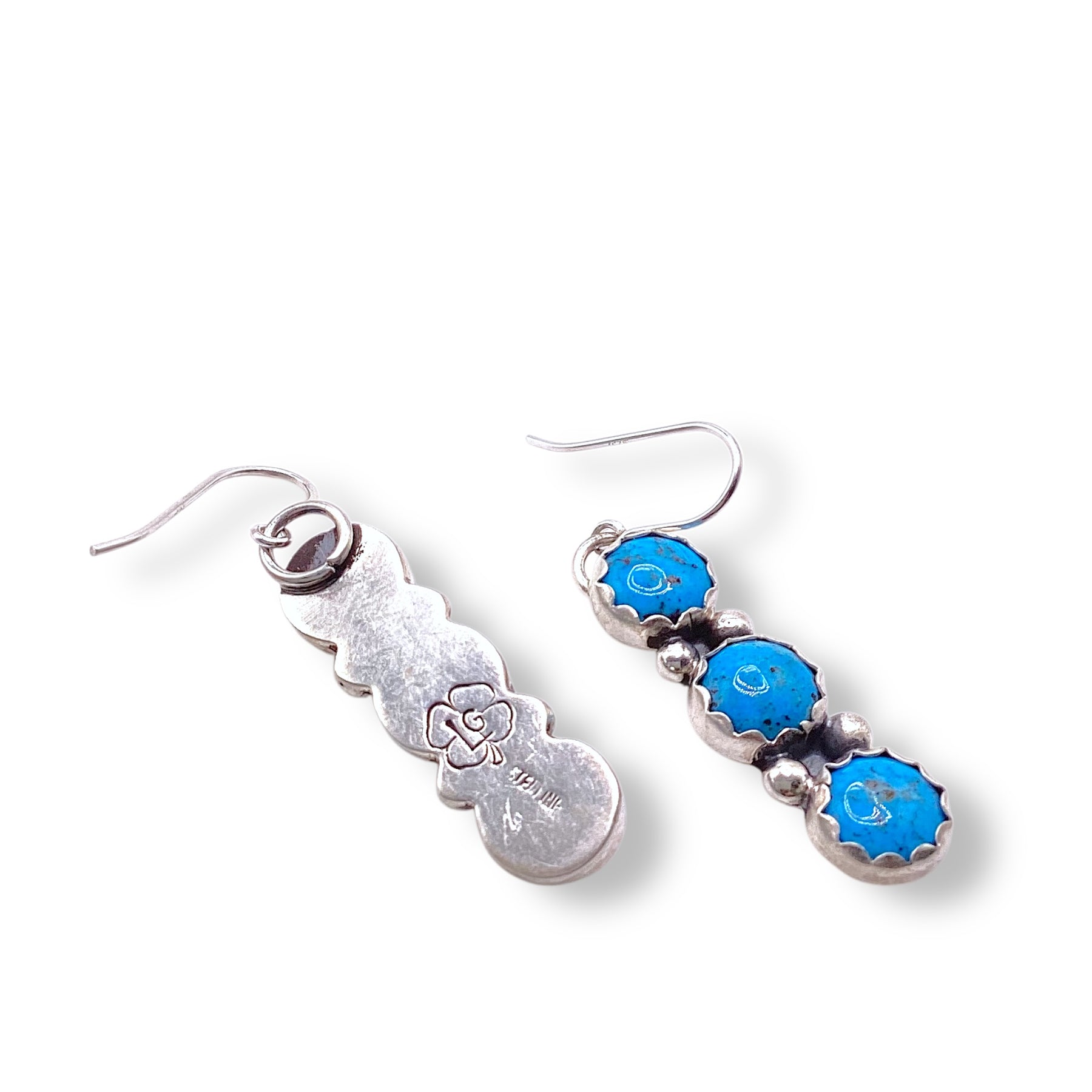 Turquoise dangle earrings by Navajo artist Lyanne Goodluck. A dreamy lineup of vibrant turquoise stones, each set in scalloped sterling silver bezels, with a little sway and a whole lot of Southwest soul.