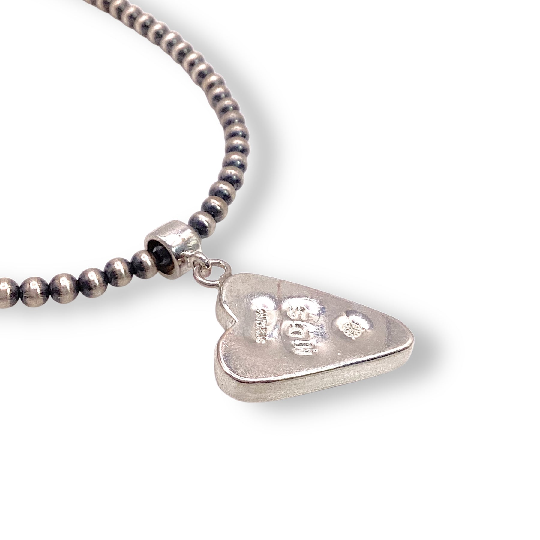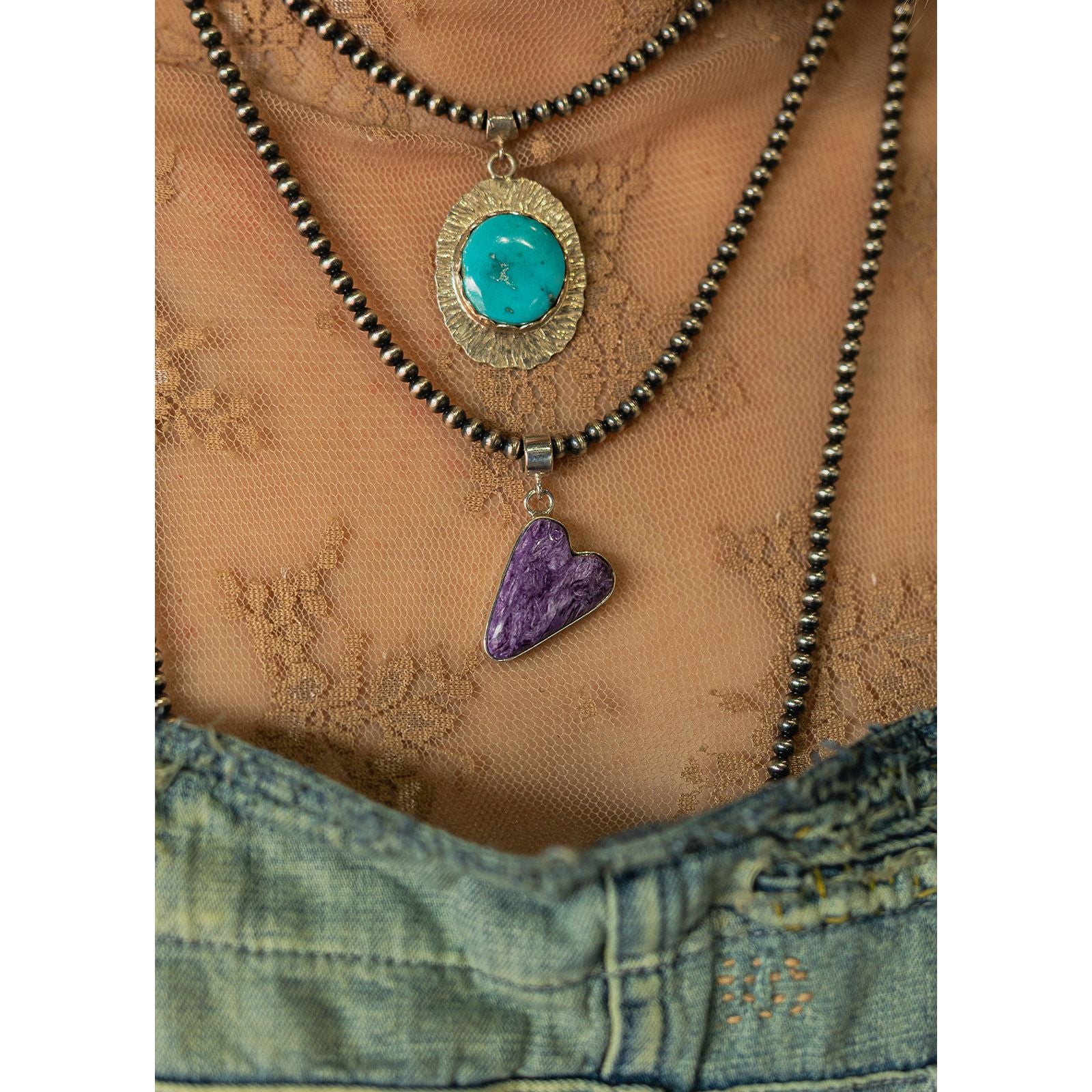 This eye-catching pendant by local musician and Southwestern artist, Michael Silberhorn, features a rich, swirling charoite stone cut into a heart shape, set in a sleek sterling silver smooth bezel. The pendant is designed to hang at a gentle angle, giving the classic heart silhouette a fresh, modern feel while letting the natural beauty of the stone shine.