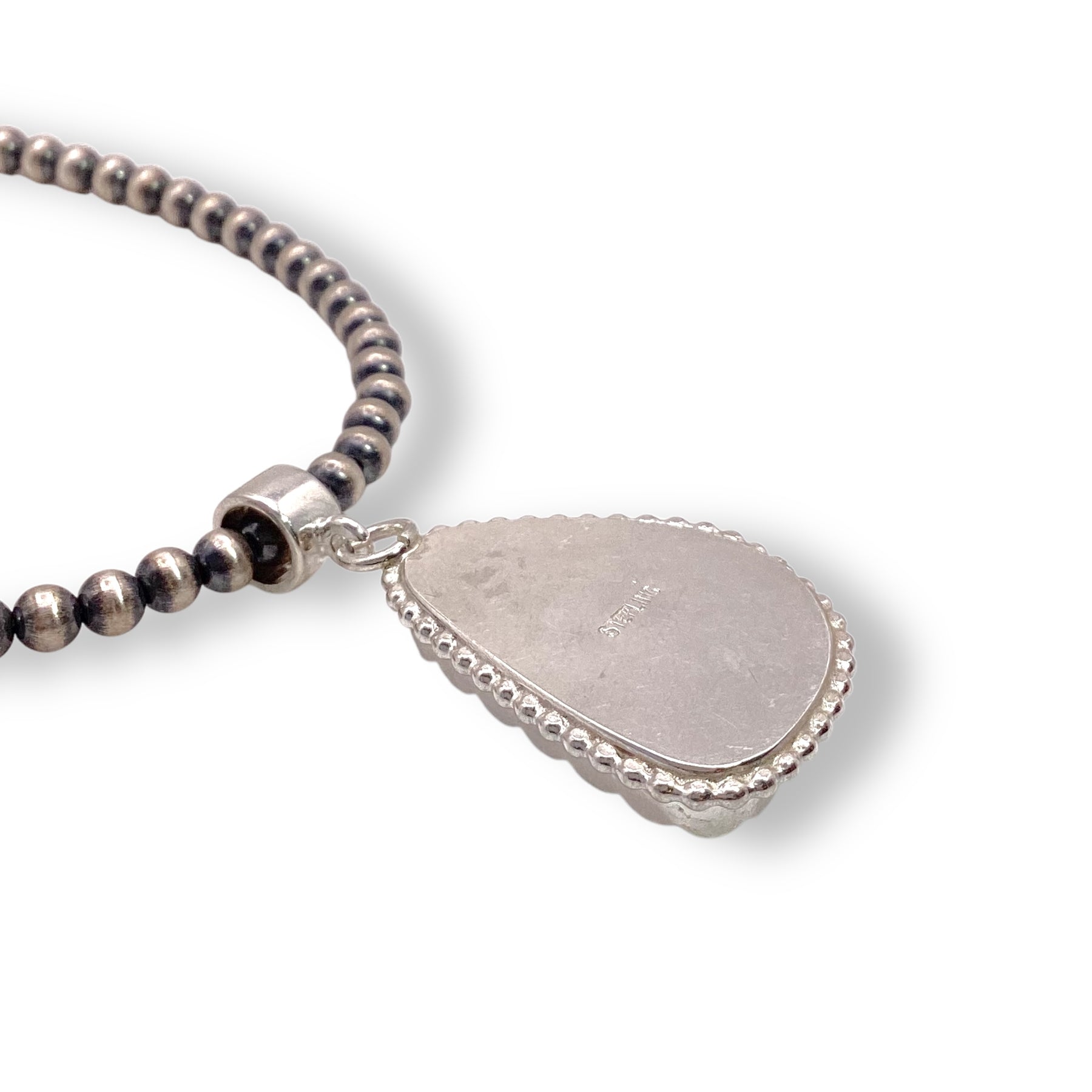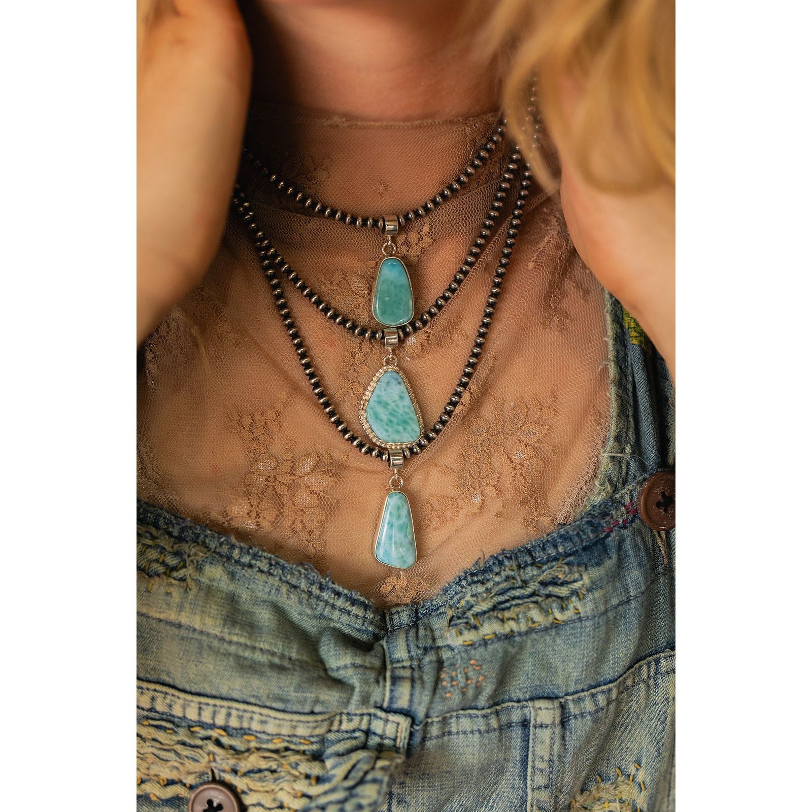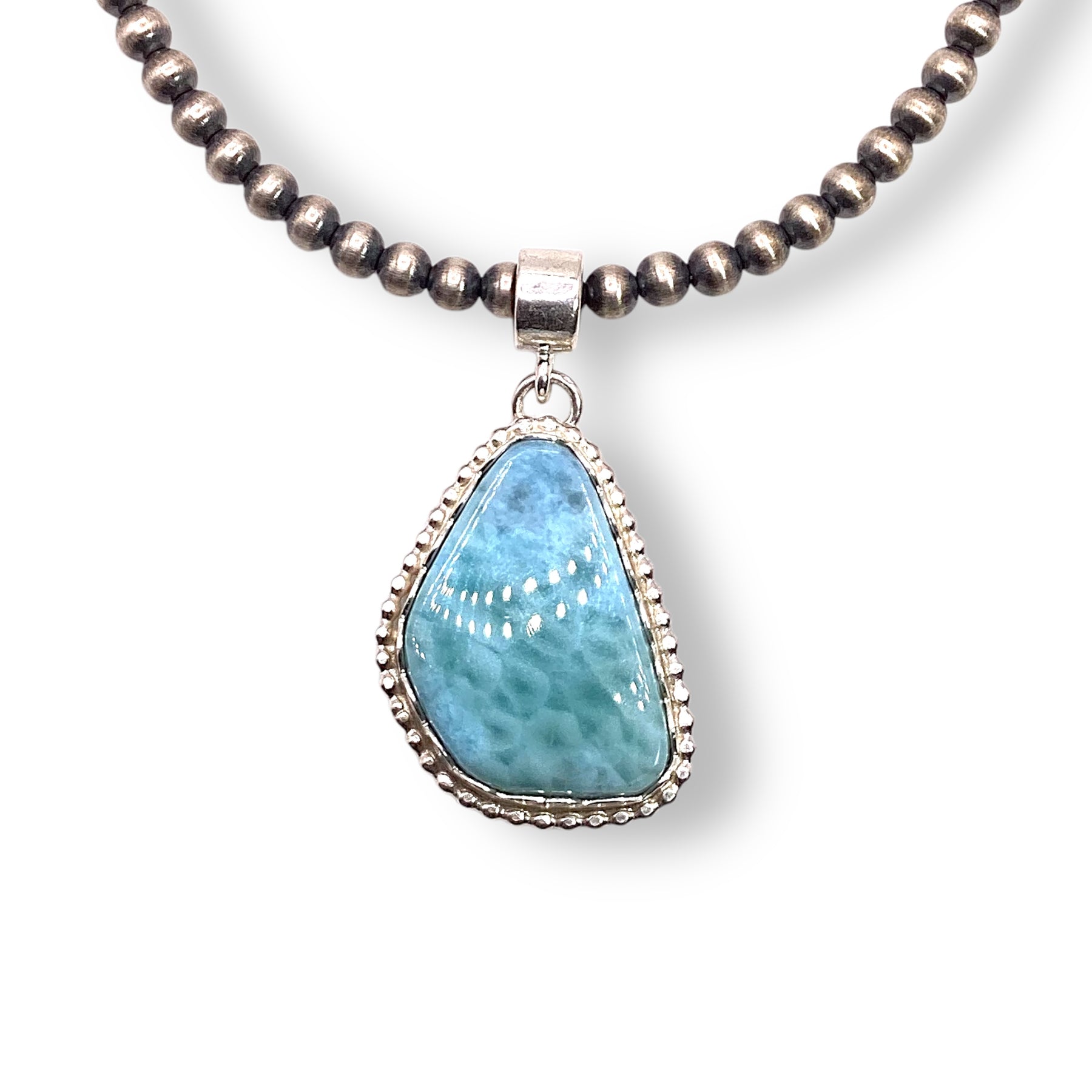 Crafted by local musician and Southwestern silversmith Michael Silberhorn, this pendant features a tranquil larimar stone with dreamy blue tones, reminiscent of tropical seas. It’s set in a sterling silver scalloped bezel and accented with delicate silver beadwork that adds texture and a touch of traditional charm.