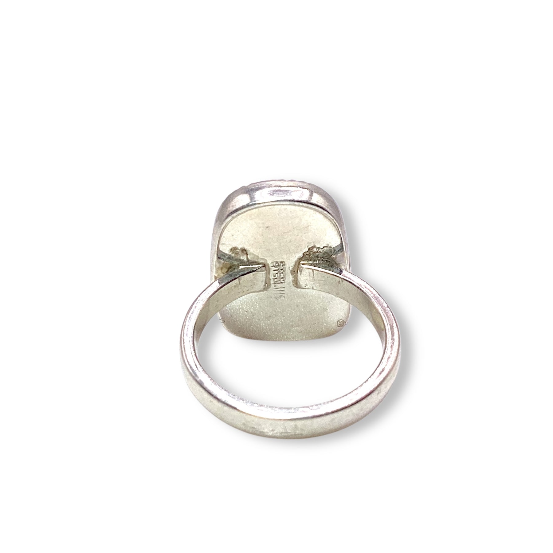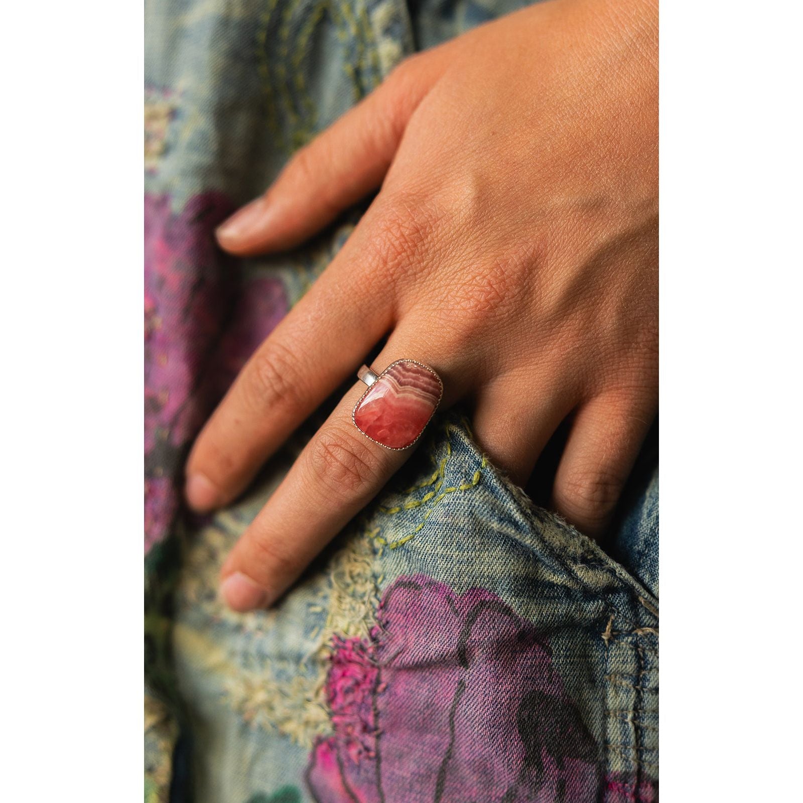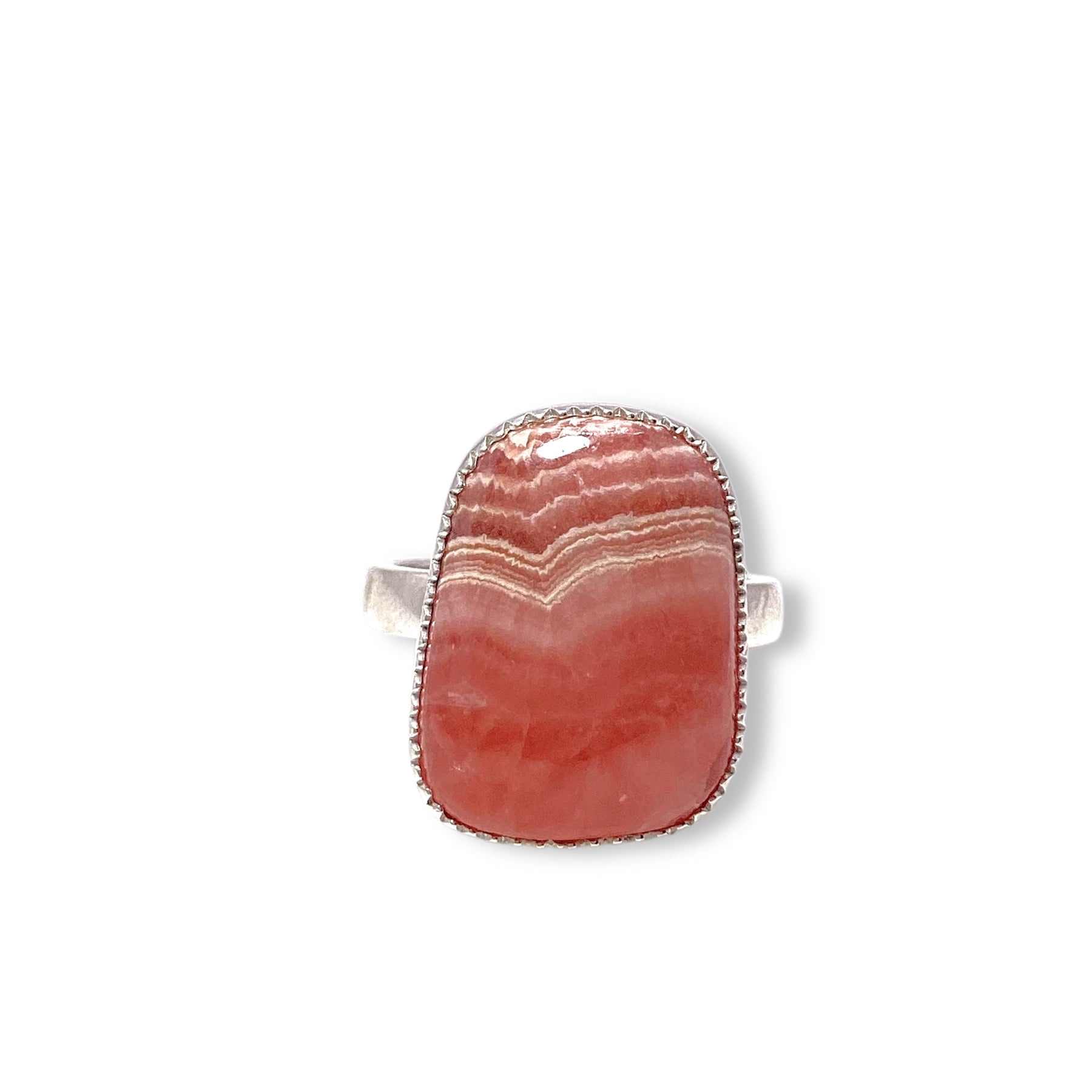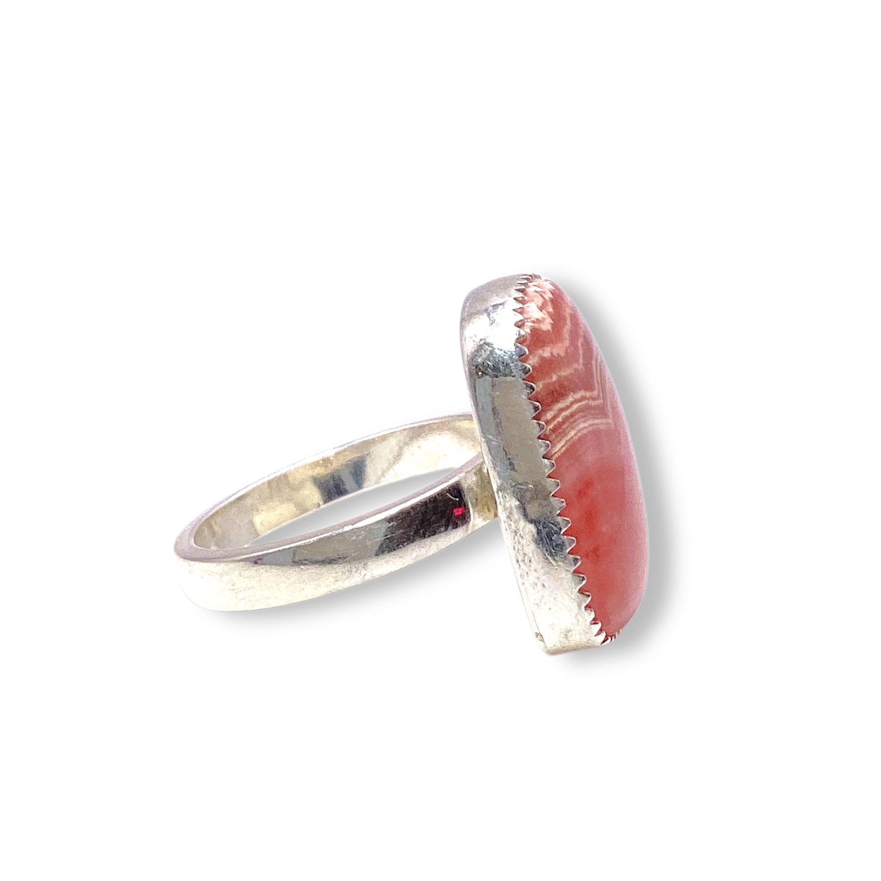 This lovely ring by local musician and Southwestern silversmith Randy Silberhorn features a vibrant rhodochrosite stone, known for its rich pink hues and natural, swirling patterns. Set in a sterling silver sawtooth bezel, the design makes a powerful statement while allowing the stone's beauty to take center stage.