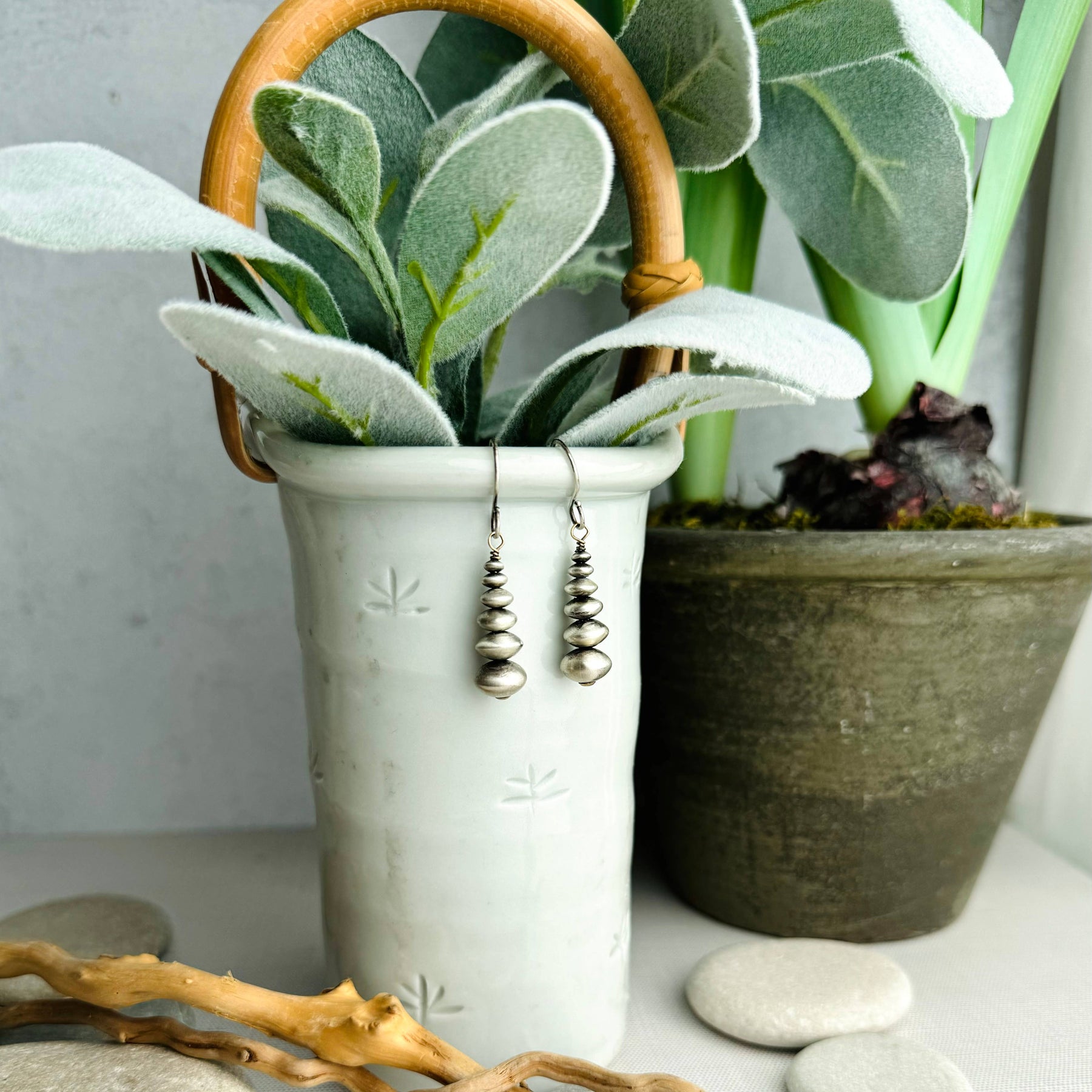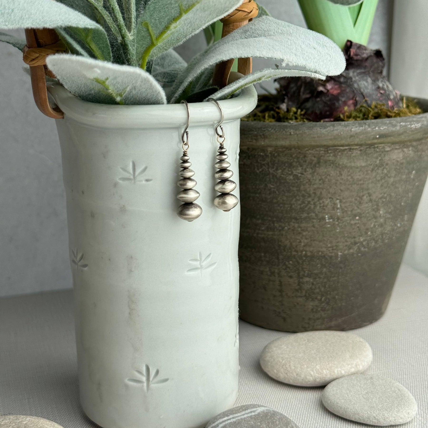 Stacked stones, known as Cairns have a rich history over many regions, religions, and meditation. They even guide hikers and travelers in a literal sense by stacking stones on the side of trails and rivers. They are known to represent balance, strength, and energy. These earrings are sterling silver, 1.25”, and light weight!