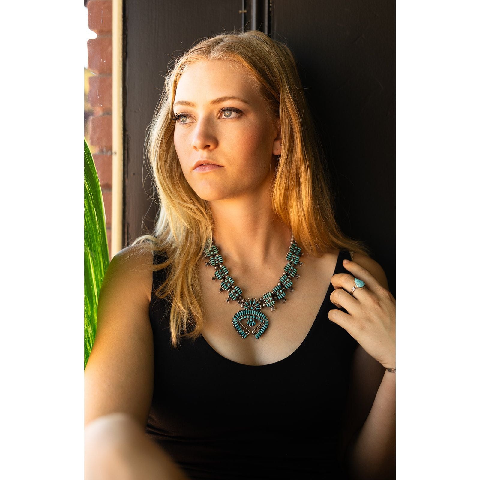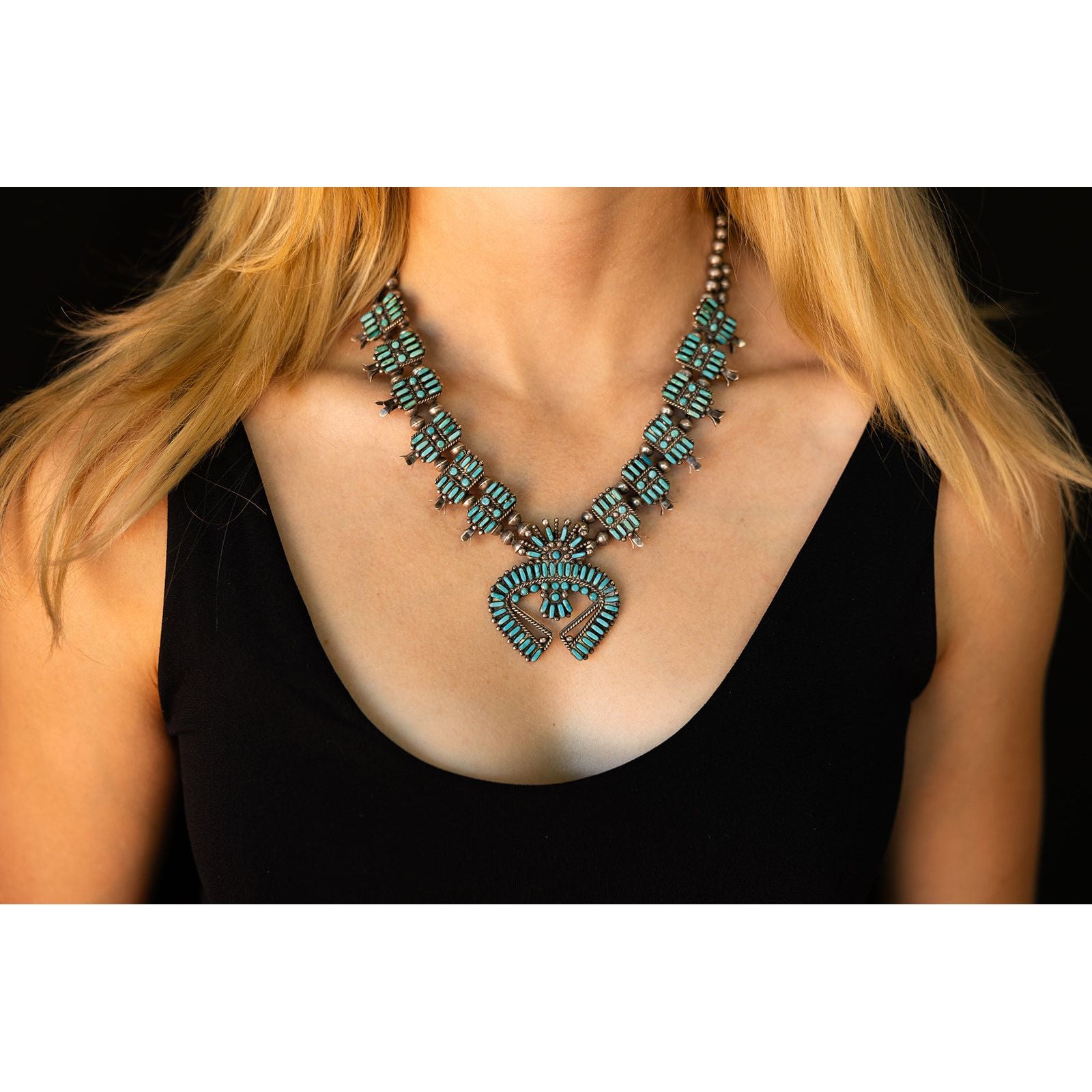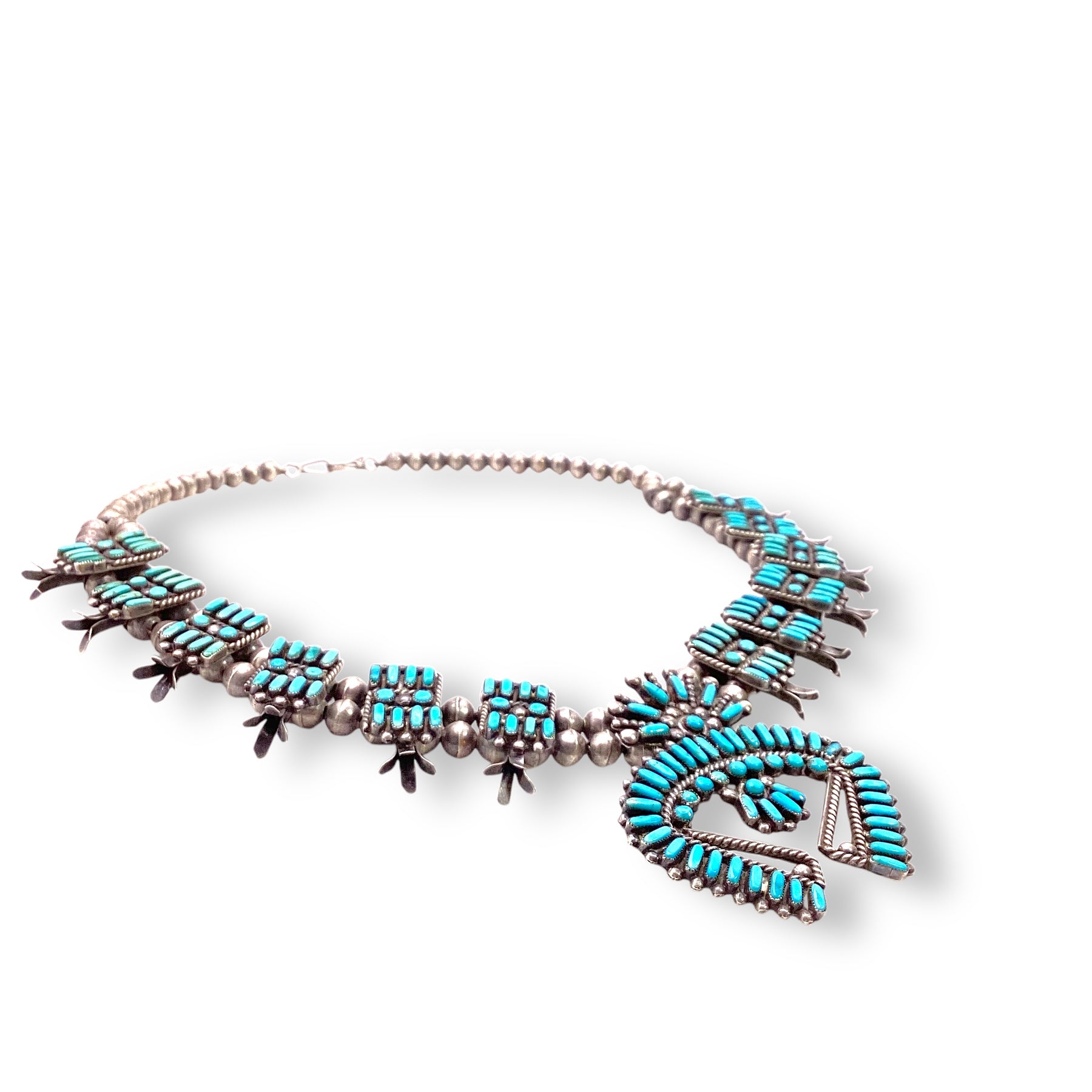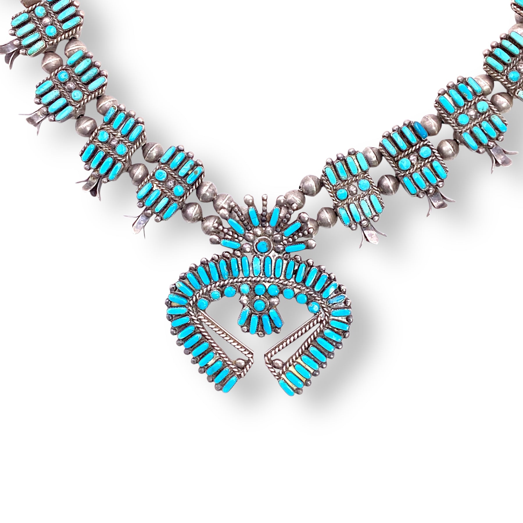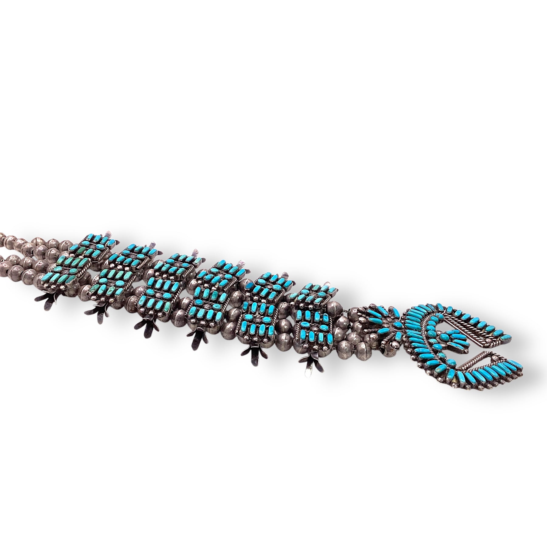 This is truly a one of a kind piece and is simply stunning! This vintage Zuni petite squash blossom necklace is pure Southwestern charm. Handcrafted in sterling silver, it features delicate petite point turquoise stones arranged in sweet blossoms that line the chain and frame the central naja pendant.